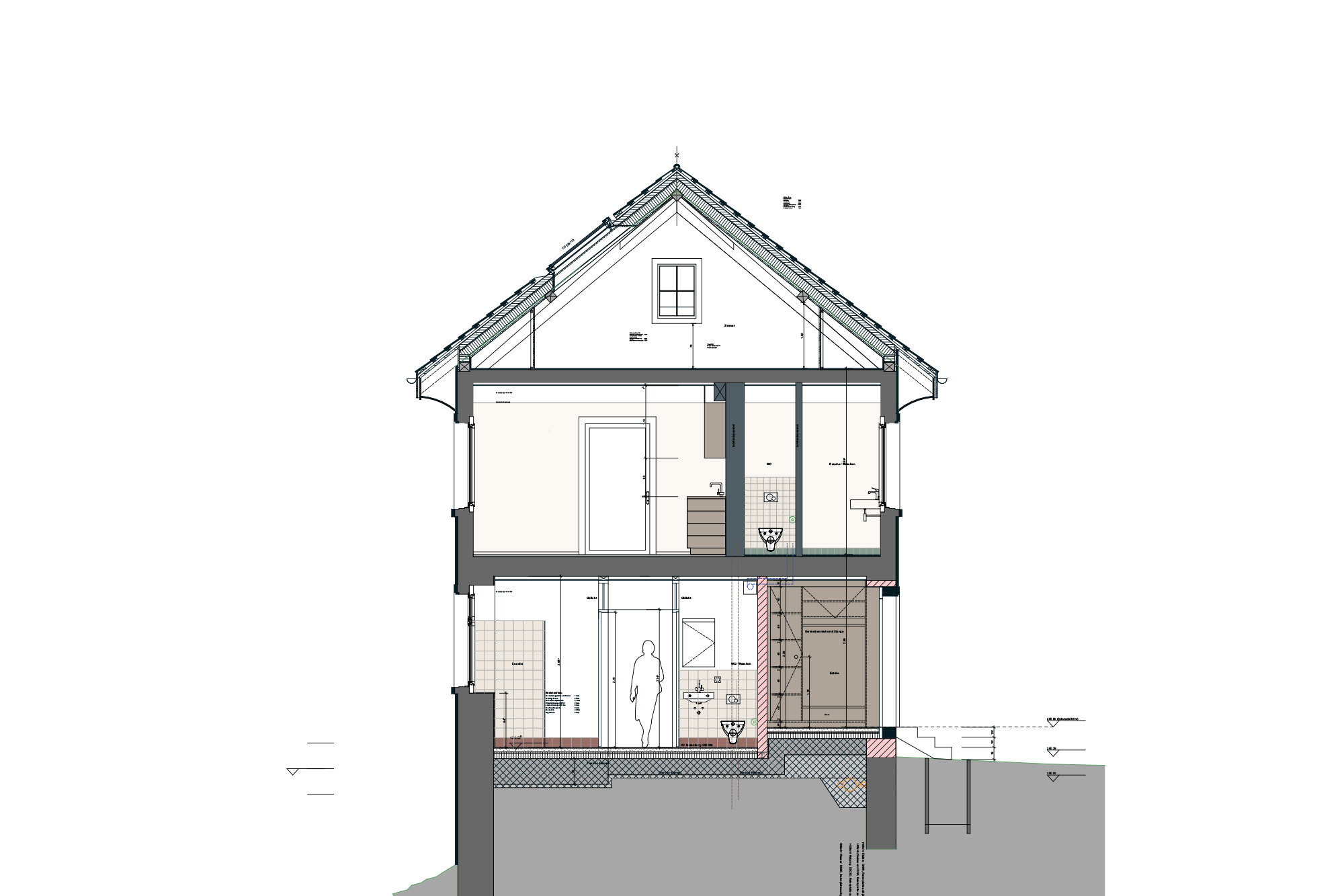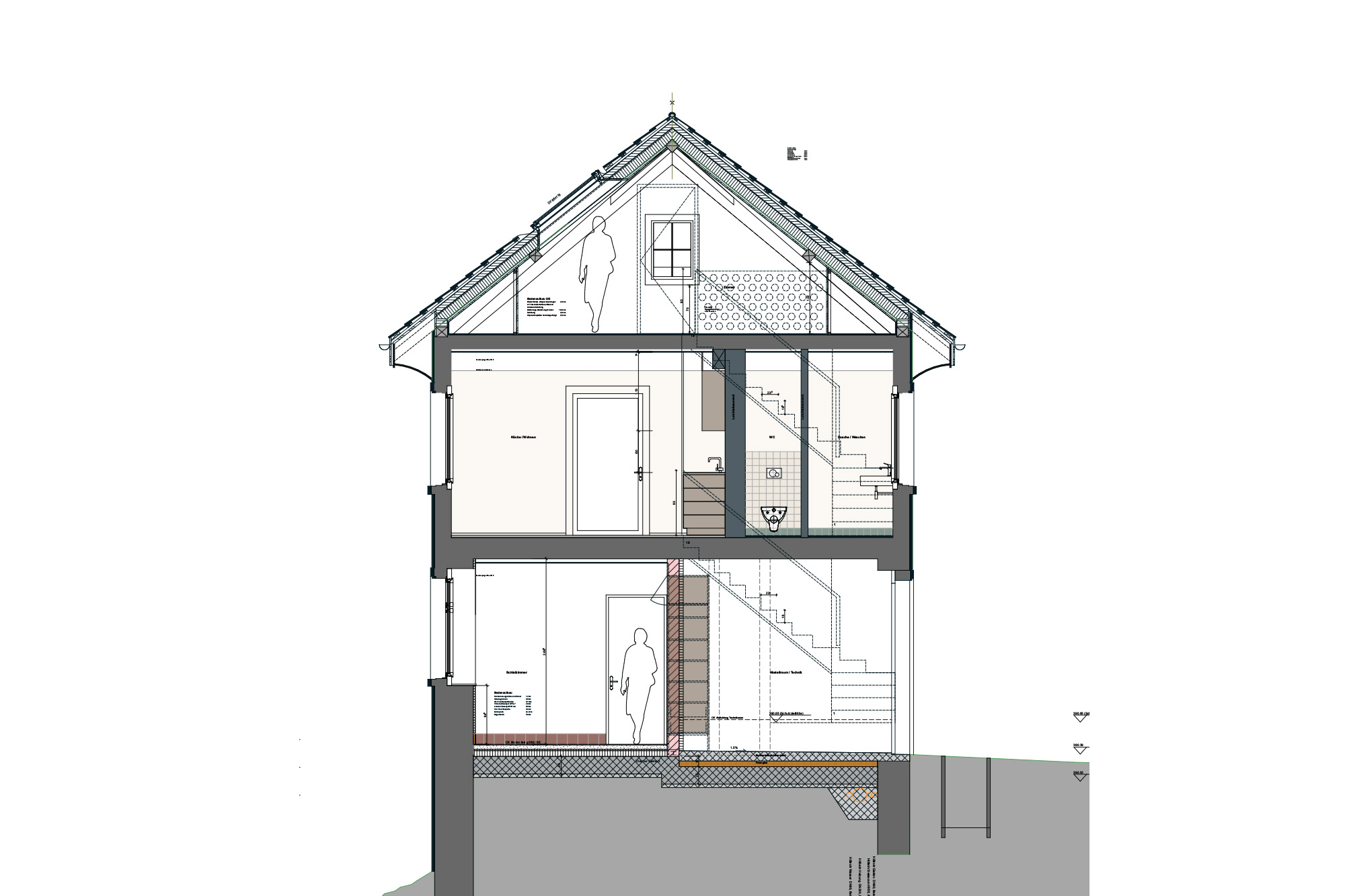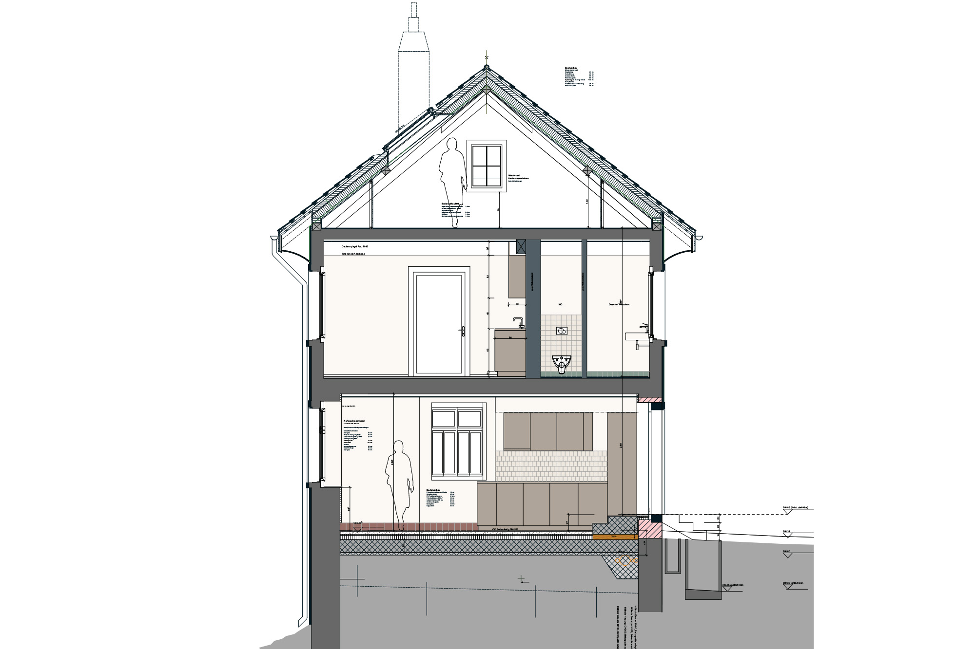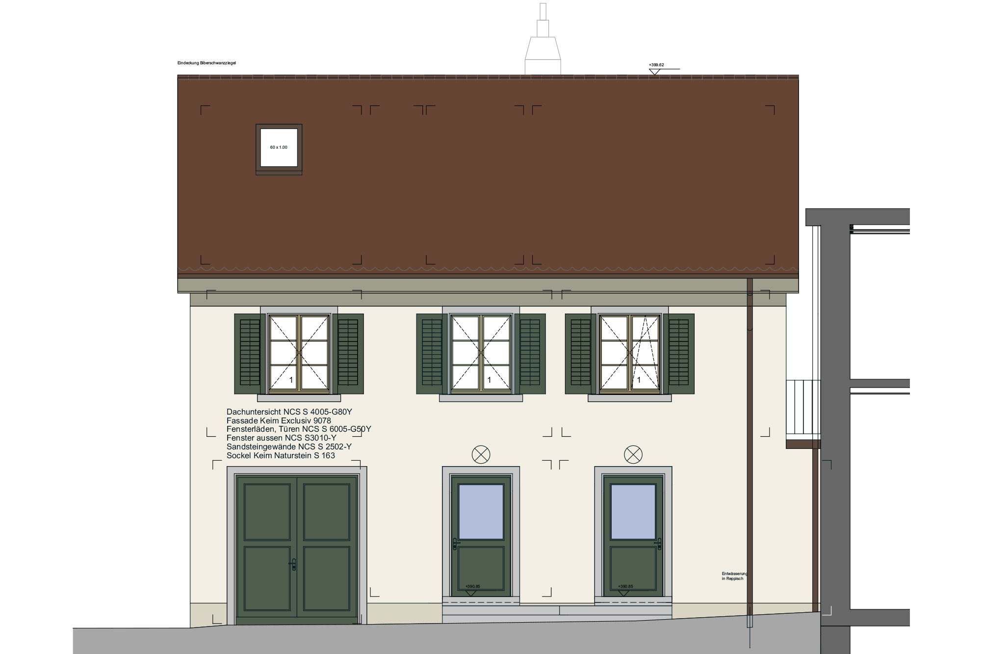 Das kommunal denkmalgeschützte Haus liegt im Zentrum des historischen Dorfkerns von Dietikon und sehr nahe an der Reppisch. Es wird integral denkmalpflegerisch instandgesetzt und in ein reines Wohnhaus mit Mietwohnungen überführt. Die ergdgeschossige Wohnung lässt über die Materialisierung/Farbgebung und dem erhaltenen Räucherofen Erinnerungen an die Wursträucherei aufkommen, die hier einstmals betrieben wurde. Die obere doppelgeschossige Wohnung hält sich in Materialität und Atmosphäre am ehemals hölzernen Charakter diese bäurischen Hauses und spielt im Obergeschoss einen grossen stützenfreien Wohnraum frei, was mit dem Tragwerk des Daches korrespondiert. Obergeschoss und Dachgeschoss waren einst stützenfrei. Die bestehende seitliche Terrasse zur Reppisch verbindet diese Wohnung mit dem lauschigen und ruhigen Aussenraum.