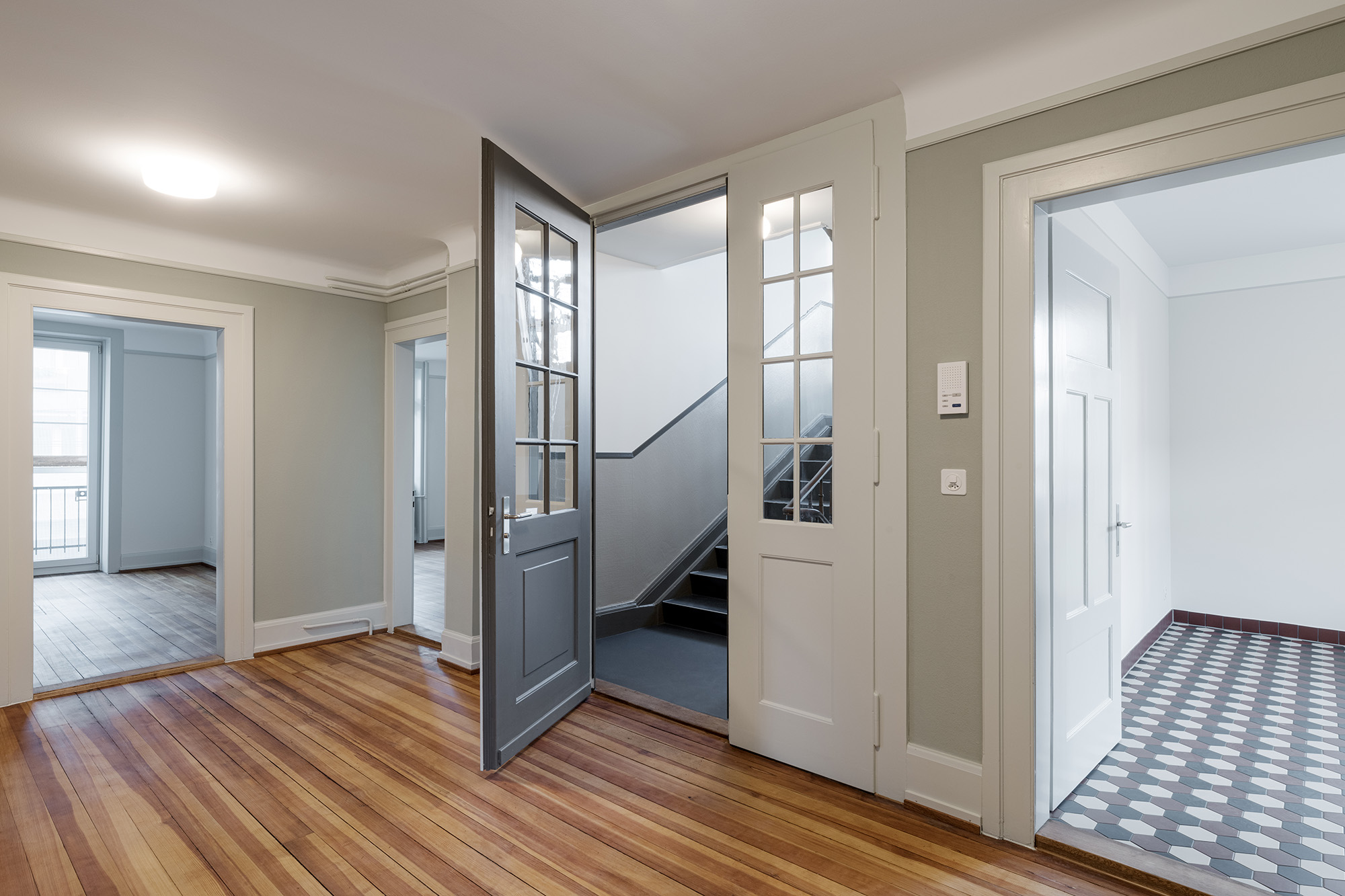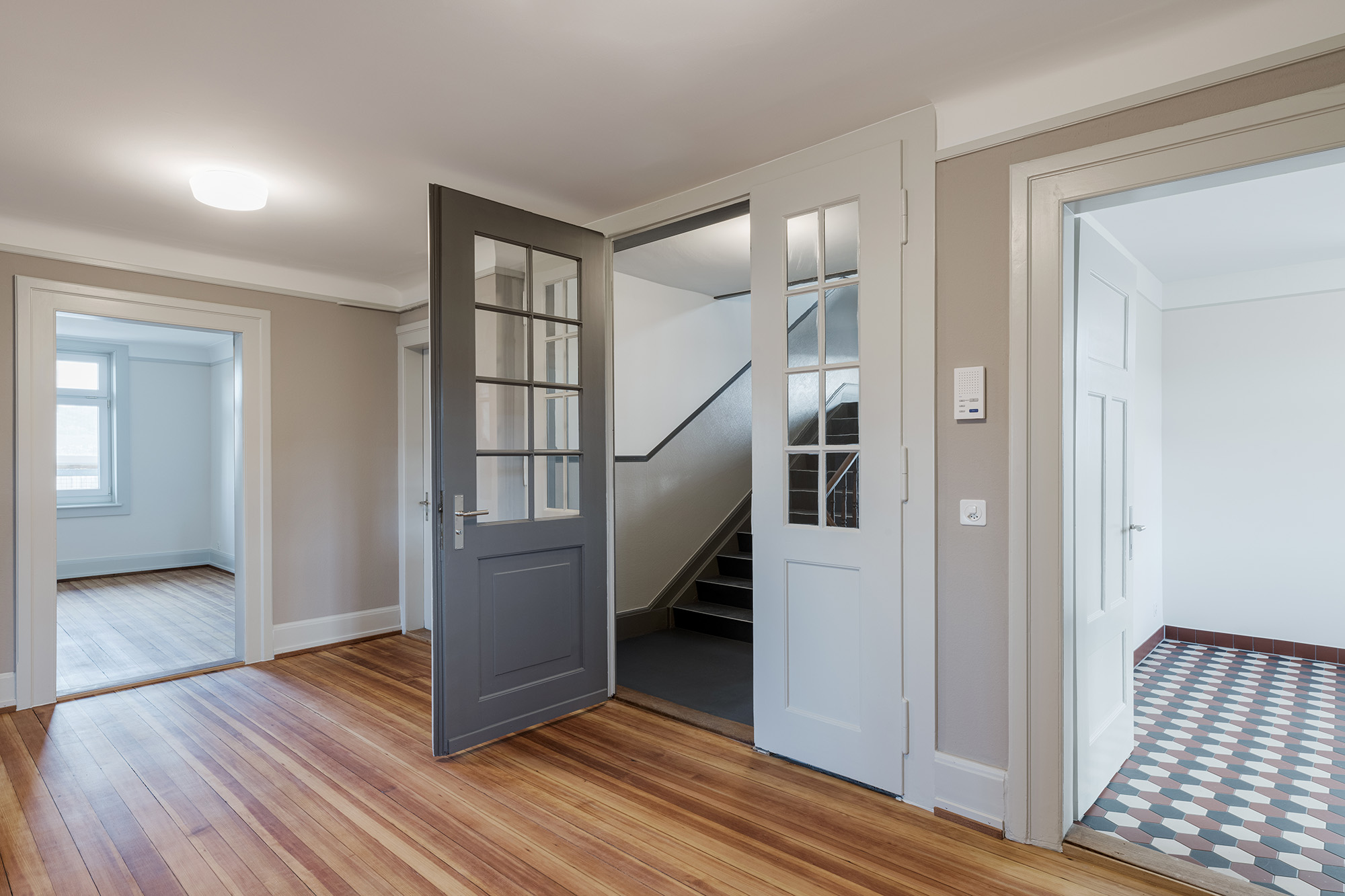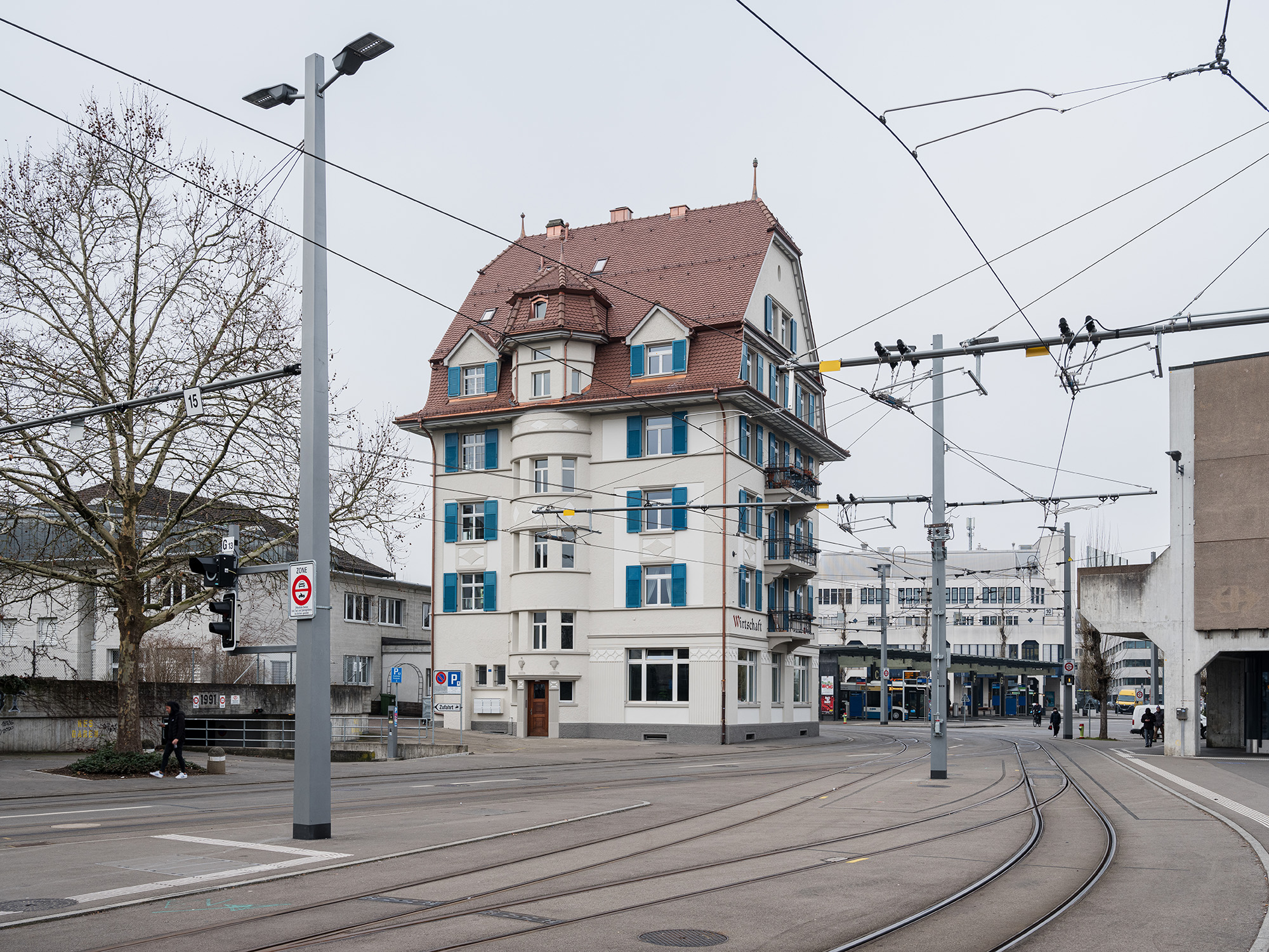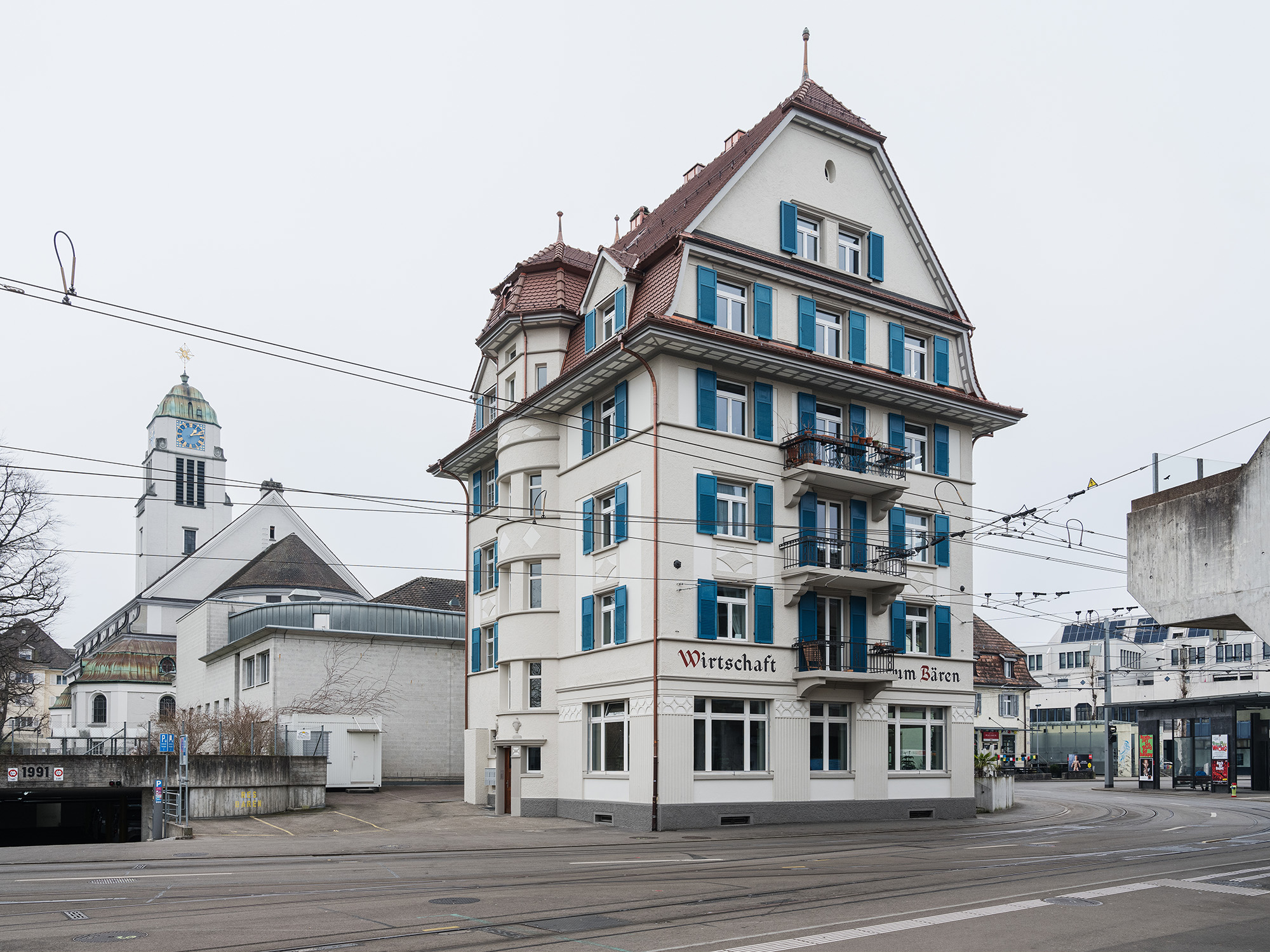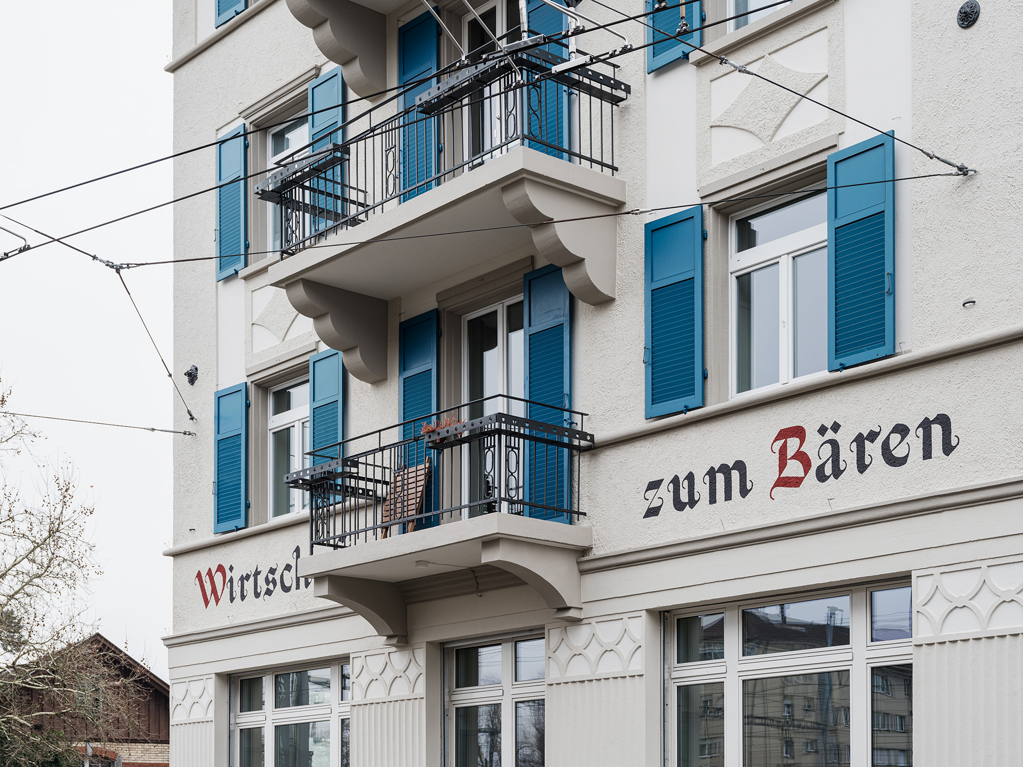 Selbstbewusst und identitätsstiftend steht der markante und denkmalgeschützte Bären seit 1910 als wichtiges Element am Platz vor dem Bahnhof Dietikon. Im Schweizer Heimatstil erbaut ist er vor Ort einer der wenigen Zeugen seiner Zeit. Im Zuge eines Eigentümerwechsels wurden die 5 grosszügigen Geschosswohnungen über dem Restaurant denkmalpflegerisch renoviert, wobei das oberste Geschoss mit ehemals Mansardenzimmern einen neuen Grundriss erhielt. Grosse Teile des historischen Bestandes an Böden und Decken konnten wieder hervorgeholt werden. Farbgebung und Materialisierung lehnen sich an den historischen Bestand an. Gleichzeitig wurde das gesamte Haus vom Keller bis zum Estrich situativ und behutsam so erdbebenertüchtigt, dass die Massnahmen sowohl kostengünstig als auch unsichtbar sind.