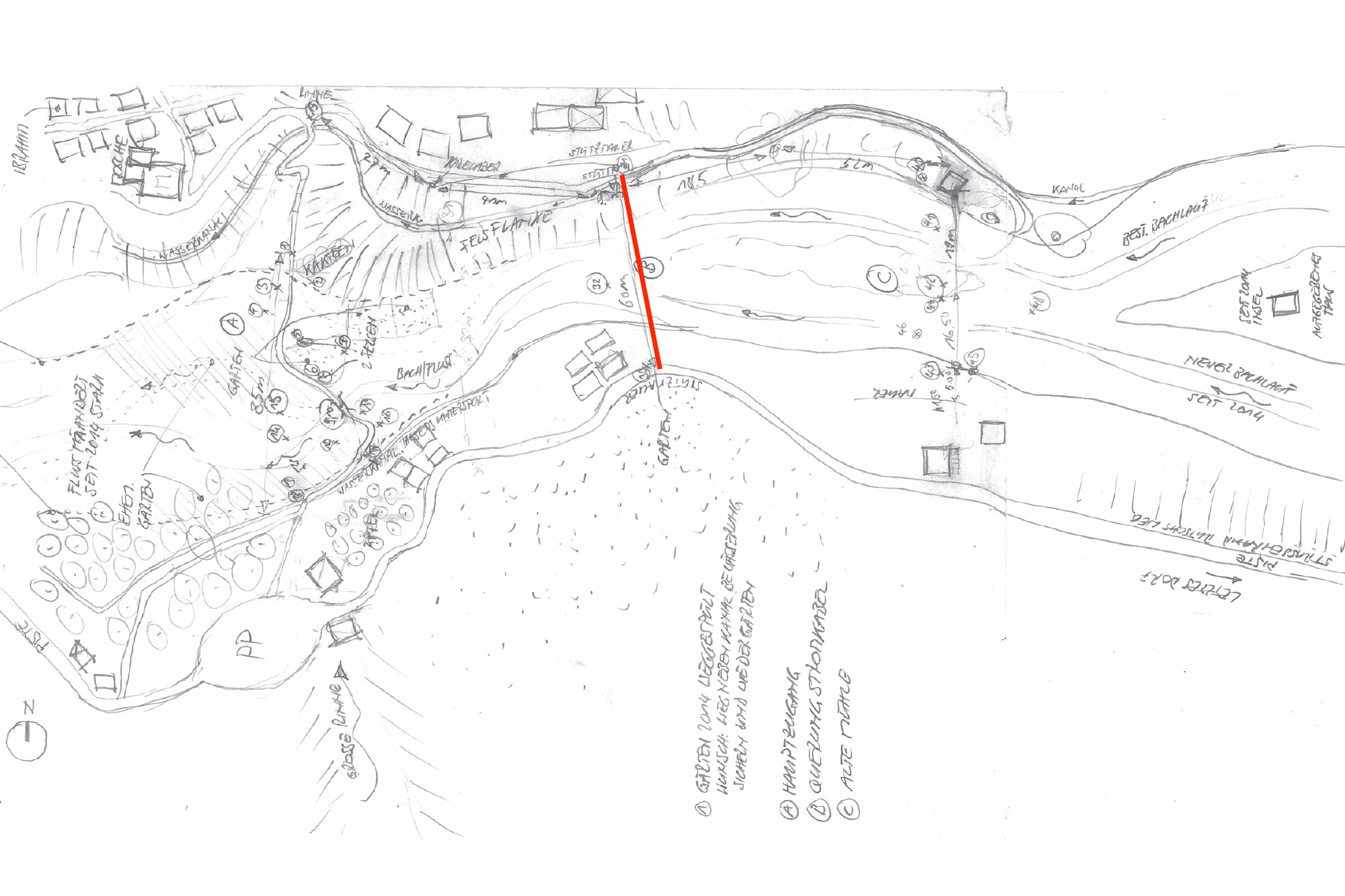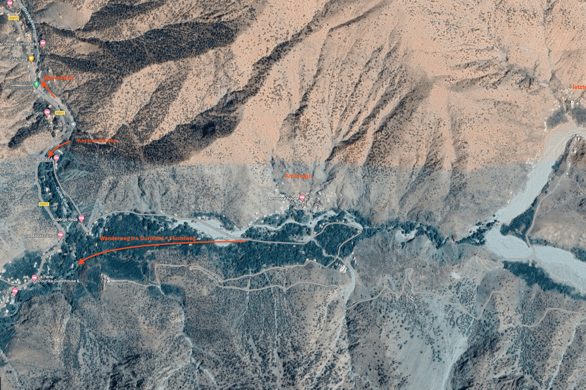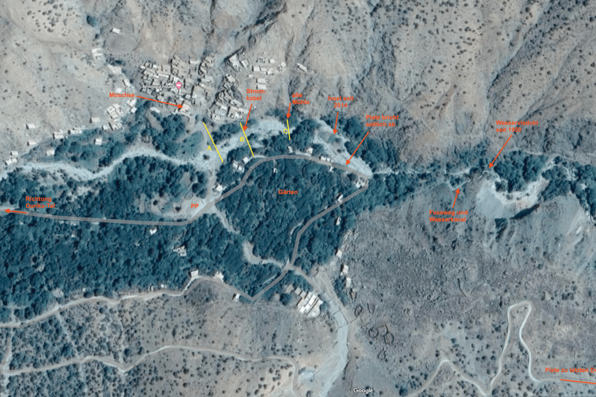 Das auf 1600 Meter in einem abgelegenen Seitental im hohen Atlas gelegene Dorf Amlougui lebt im Wesentlichen von Selbstversorgung von den Gärten, welche am Hang gegenüber dem Dorf terrassiert angelegt wurden. Die Umgebung ist rauh und trocken und liegt mitten in einem Erbebengebiet, aber der Bach vor dem Dor führt ganzjährig Wasser, welches zur Bewässrung der Felder verwendet wird. Bei Starkregen und der Schneeschmelze springt der Bach um bis zu 3 Meter, reisst die Brücke vor dem Dorf mit, zerstört Bewässerungsrinnen und erodiert die Böschungen mitsamt der darin angelegten Gärten.