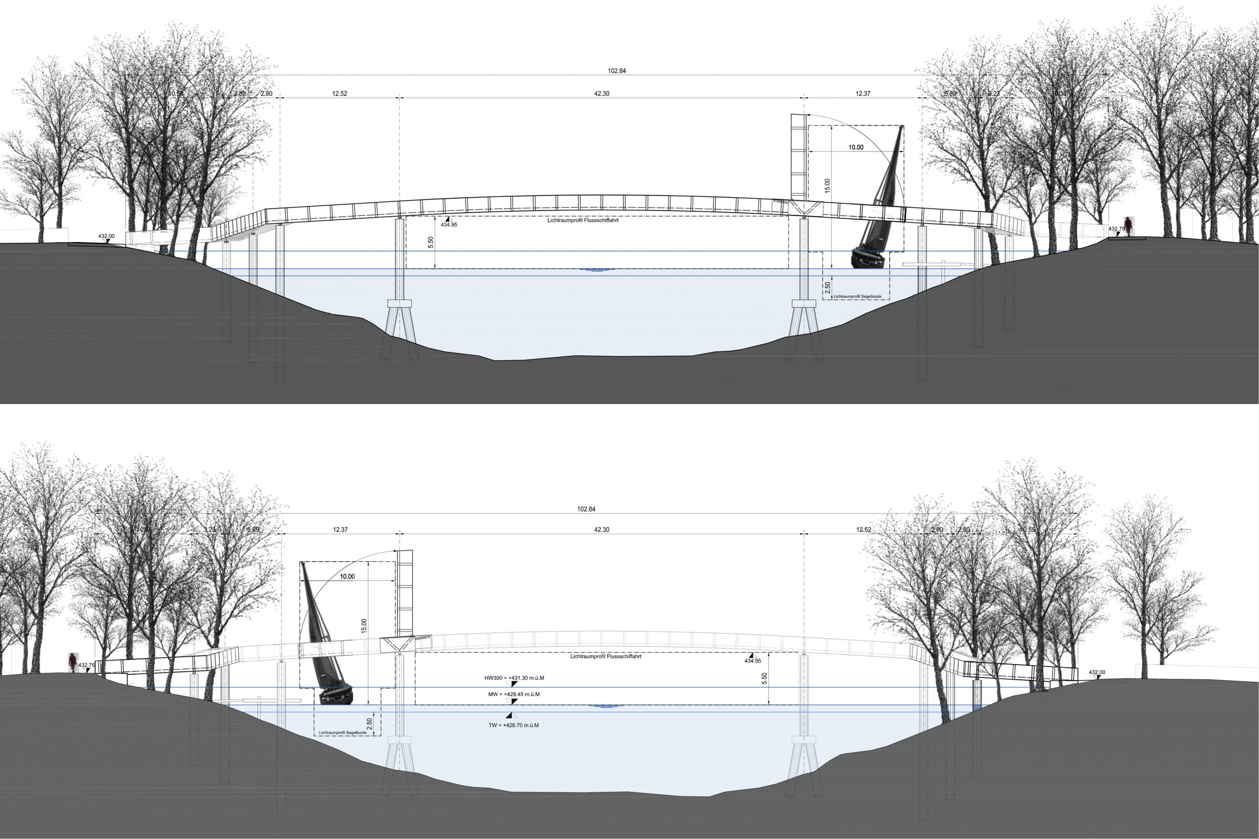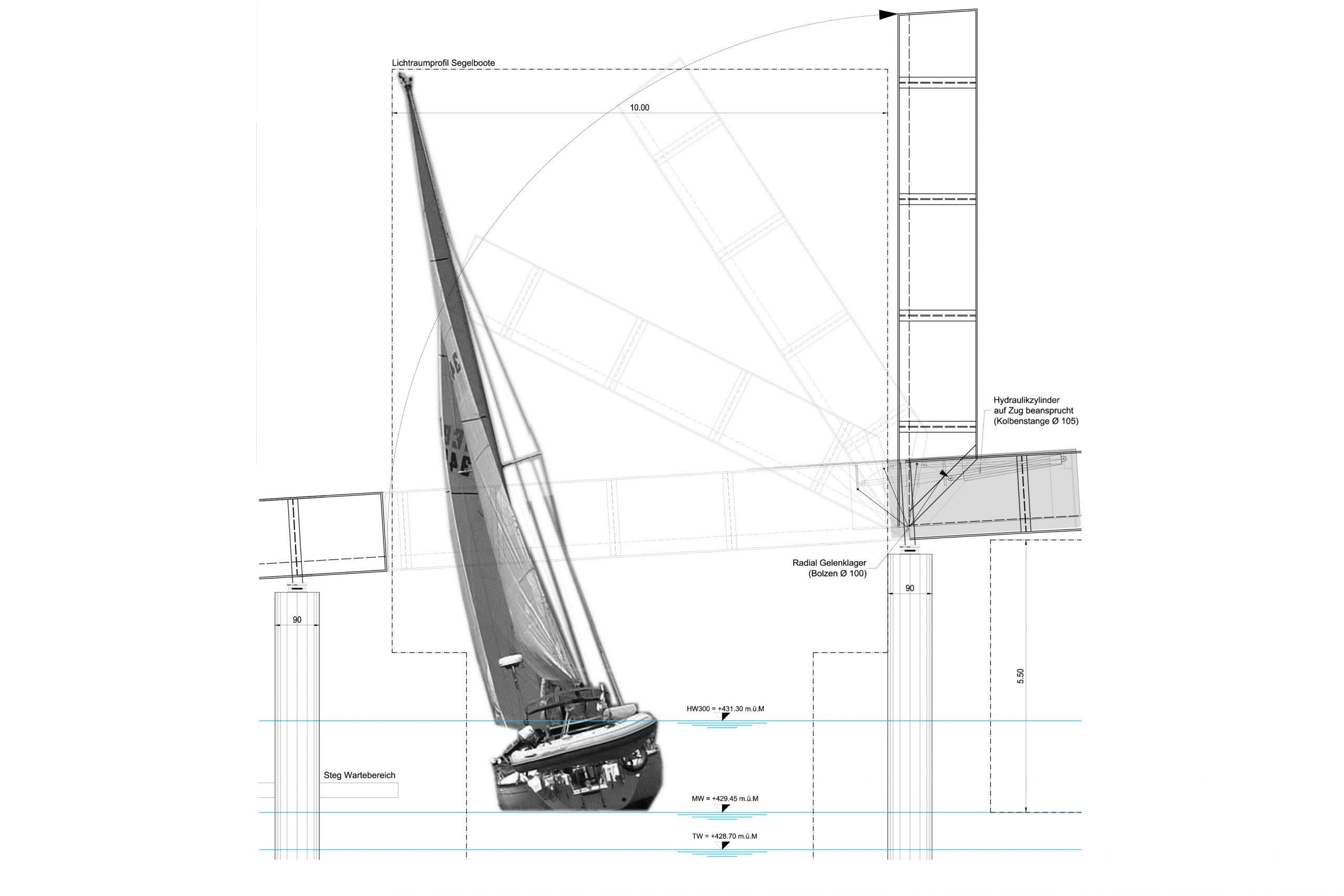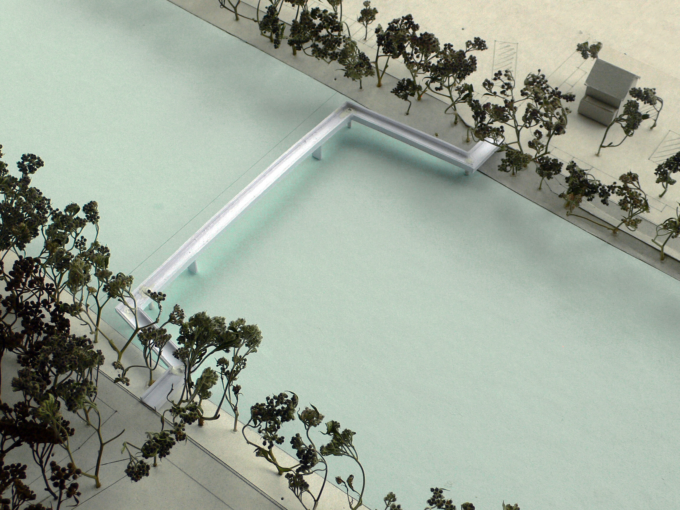 Die Fuss-Radwegbrücke erschliesst in der Nähe der Mündung des Aarekanals aus dem Bielersee von Biel her kommend neue Wohnquartiere jenseits des Kanals. Die Linienführung der Brücke wird aus den unterschiedlichen Höhen ihrer Enden entwickelt. Die unterschiedlich langen Zubringerbrückenteile führen den Passanten in Baumkronen der Ufer zum Mittelteil der Brücke und wieder zurück. Das Projekt sieht für das Passieren von Segelbooten einen Klappmechanismus des Trägers vor.