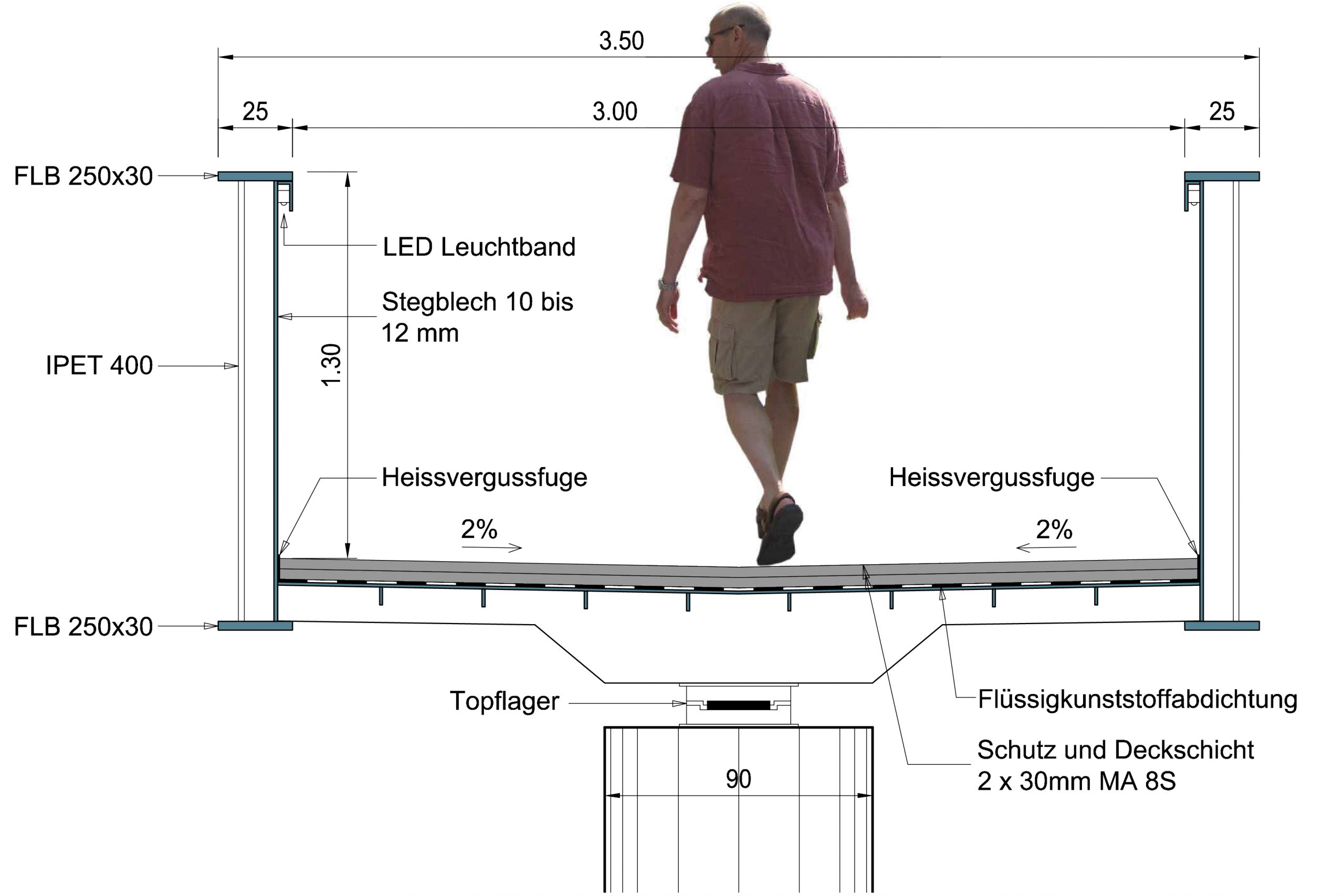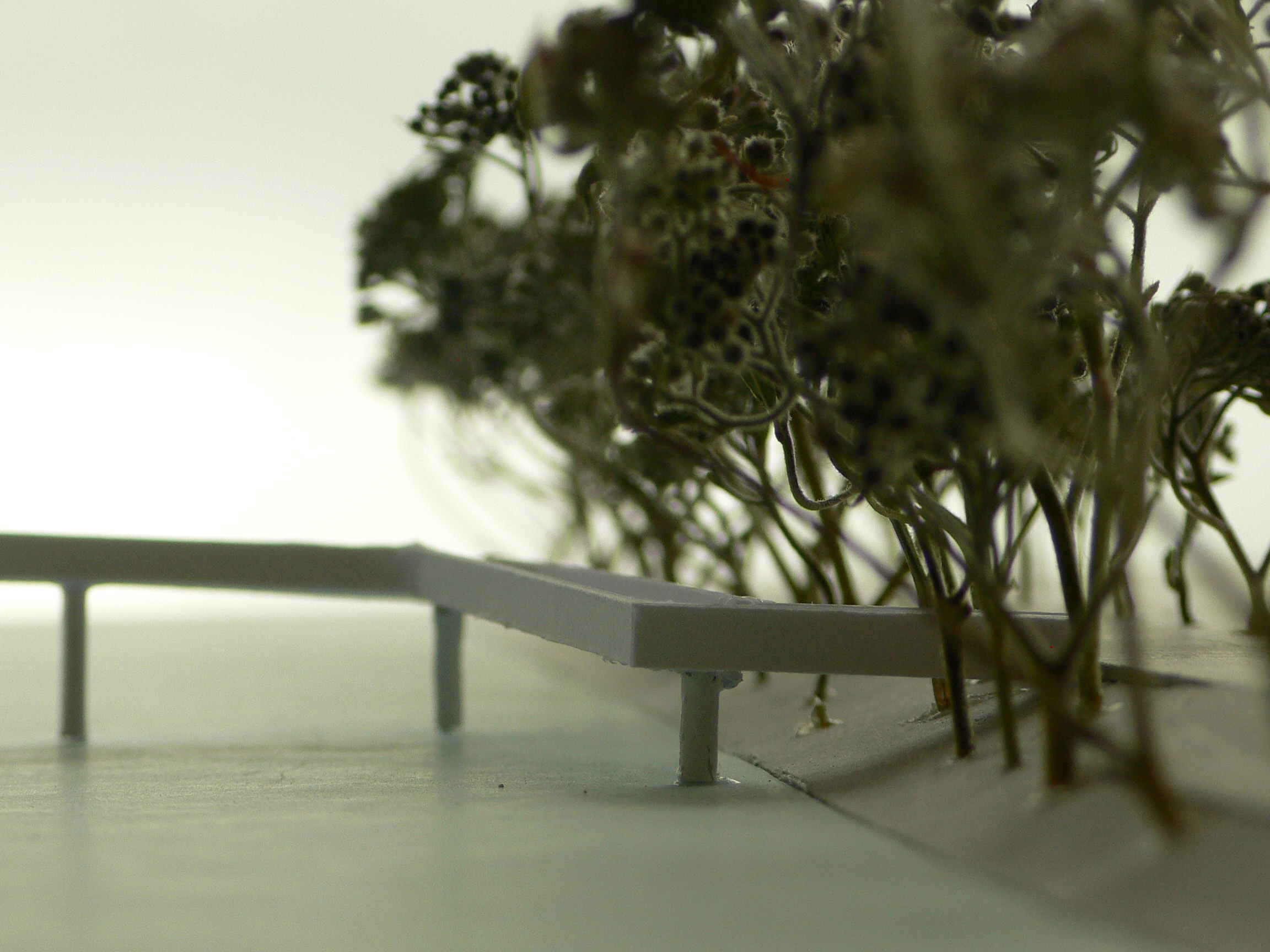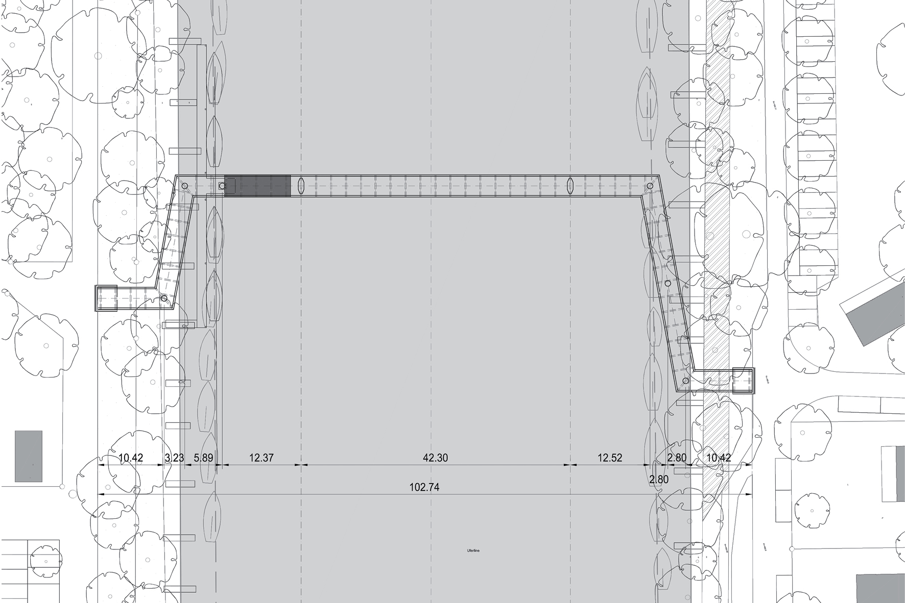 Die Fuss-Radwegbrücke erschliesst in der Nähe der Mündung des Aarekanals aus dem Bielersee von Biel her kommend neue Wohnquartiere jenseits des Kanals. Die Linienführung der Brücke wird aus den unterschiedlichen Höhen ihrer Enden entwickelt. Die unterschiedlich langen Zubringerbrückenteile führen den Passanten in Baumkronen der Ufer zum Mittelteil der Brücke und wieder zurück. Das Projekt sieht für das Passieren von Segelbooten einen Klappmechanismus des Trägers vor.
