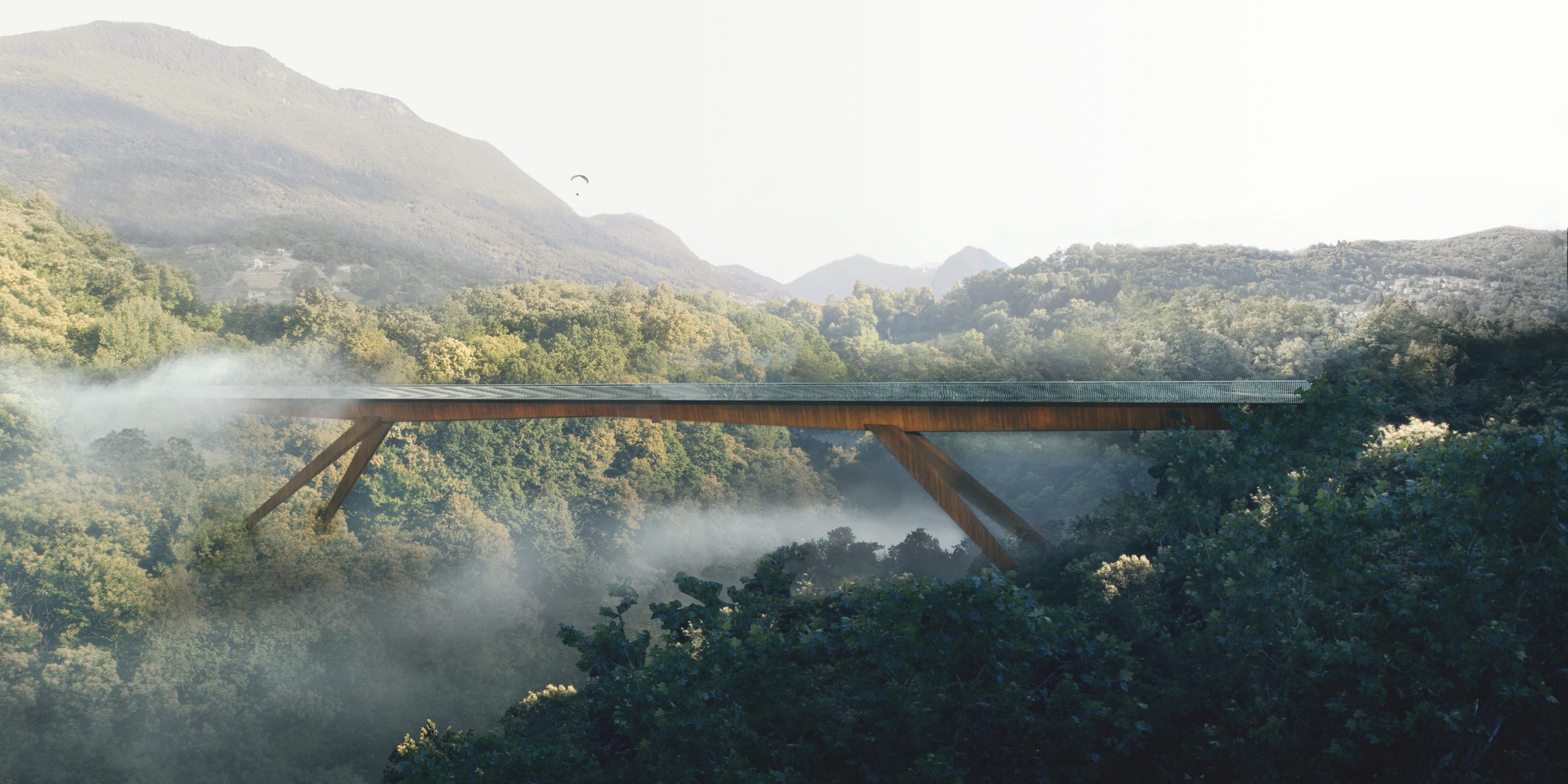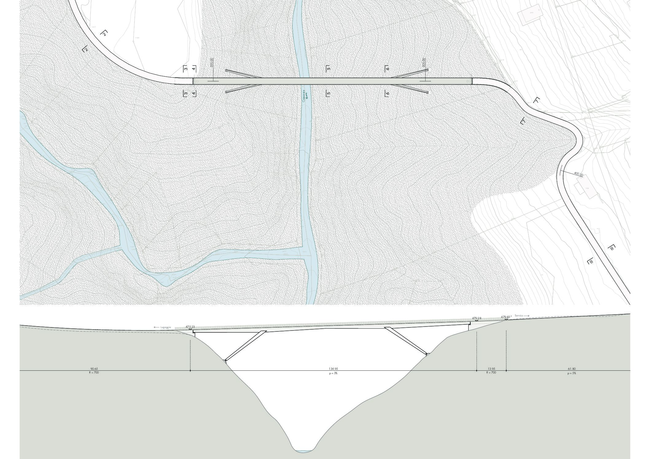 Die Ponte Spada bei Tesserete führt spektakulär 80 Meter über den Grund des steilen Tals der Cassarate. Die Brücke schliesst eine der letzten Lücken des Radwegnetzes nördlich von Lugano. Als schlankes Sprengwerk in wettterfestem Stahl konzipiert verspricht das Bauwerk grosse Stabilität und Robustheit ohne Schwingunsanfälligkeit bei minimiertem Unterhalt und relativ tiefen Kosten.