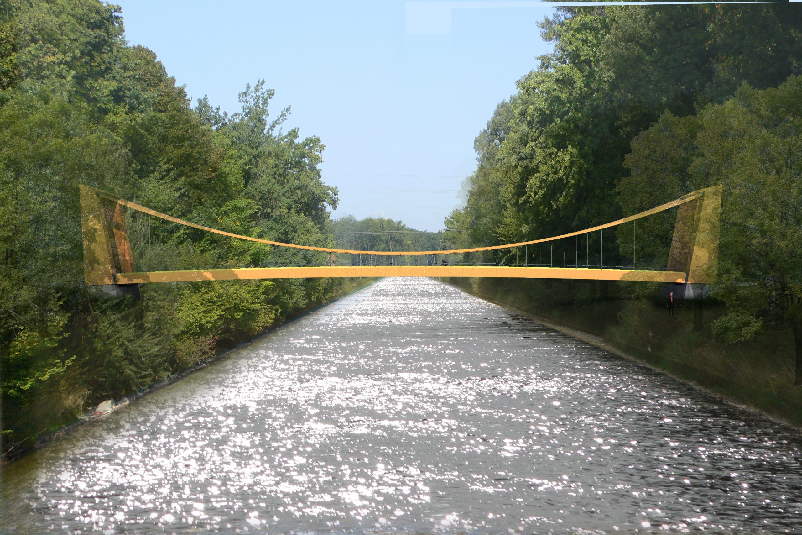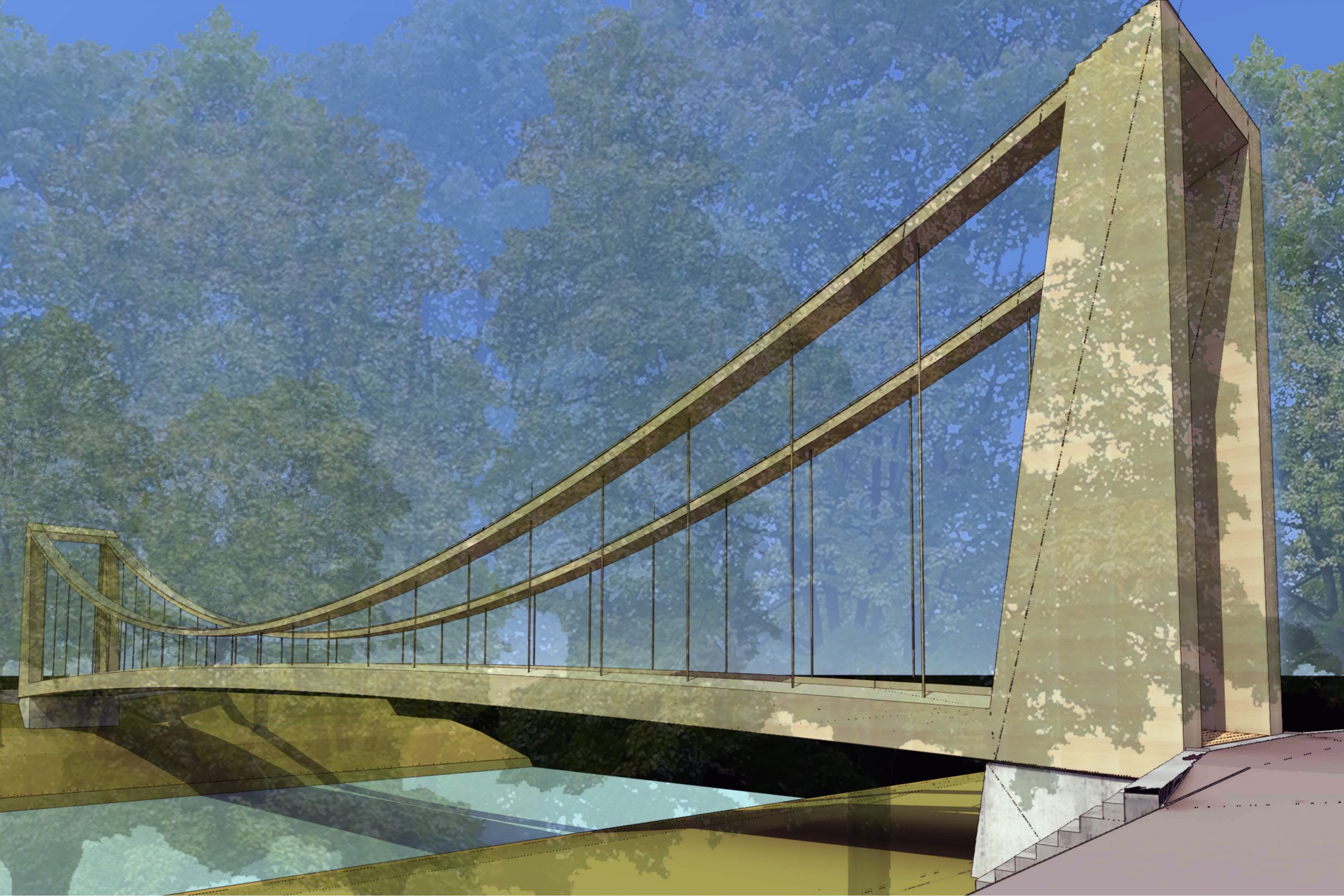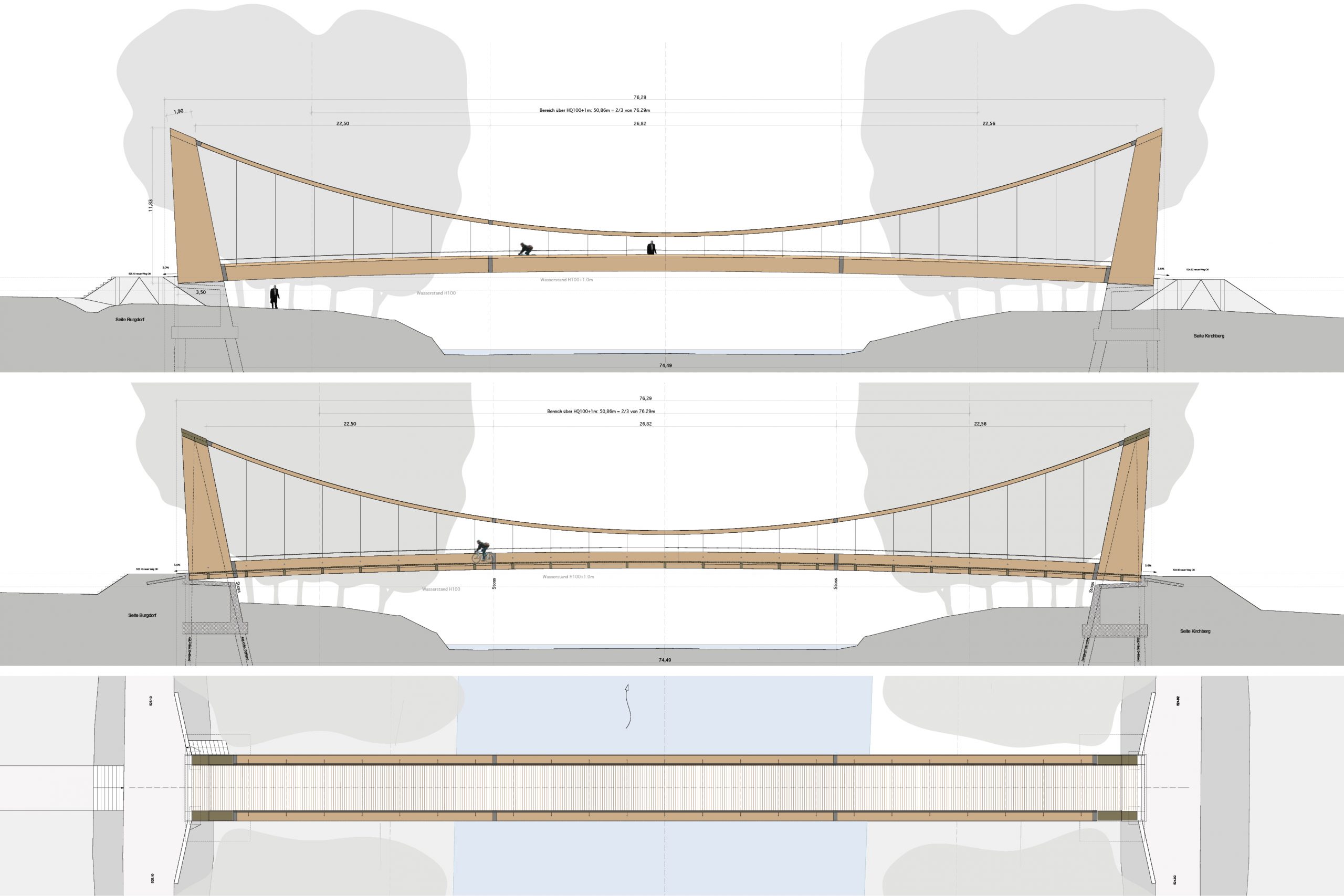 Mutig und leicht überspannt die vorfabrizierte Hängebrücke in Holzbauweise die Emme und führt zur Wiese, wo das Eidgenössische Schwingerfest stattfinden soll.