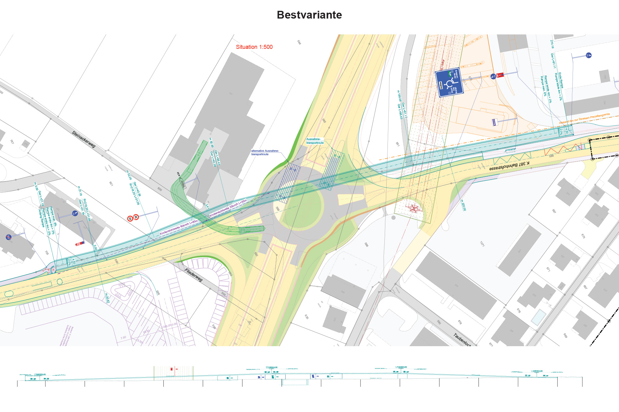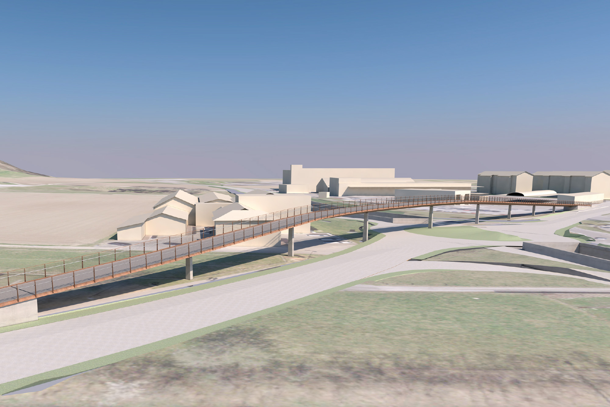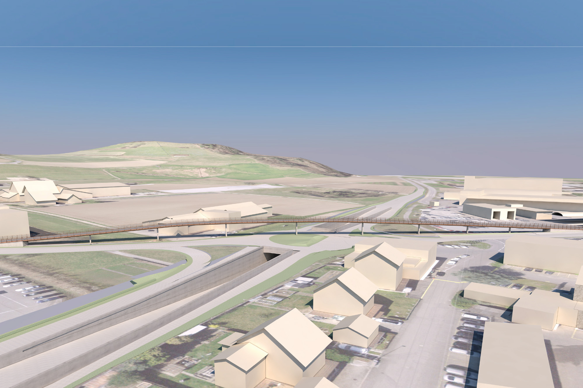 In langgestreckter Schlangenlinie überquert die neue 270m lange Passerelle für Langsamverkehr den komplexen und verkehrsreichen Knoten Langelen. Sie bildet damit die mit der geplanten entlastenden und entflechtenden Unterquerung der Hauptverkehrsachse unter dem Kreisel hindurch korrespondierende Massnahme zur langfristigen Sicherung des Verkehrsflusses für alle Verkehrsteilnehmer.