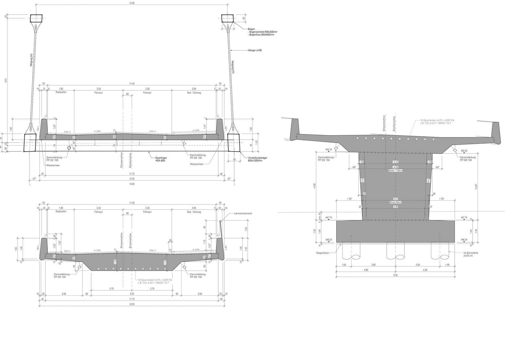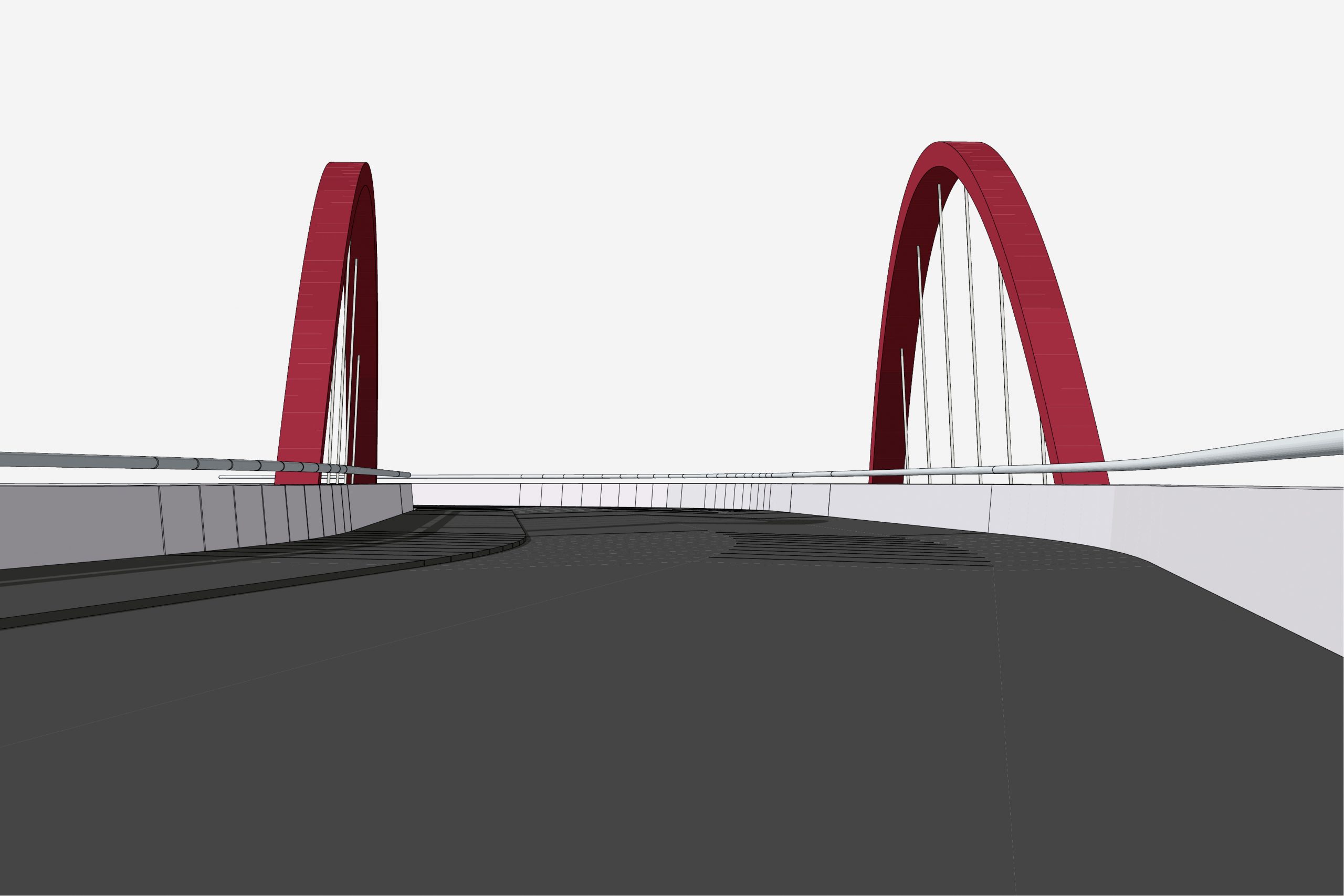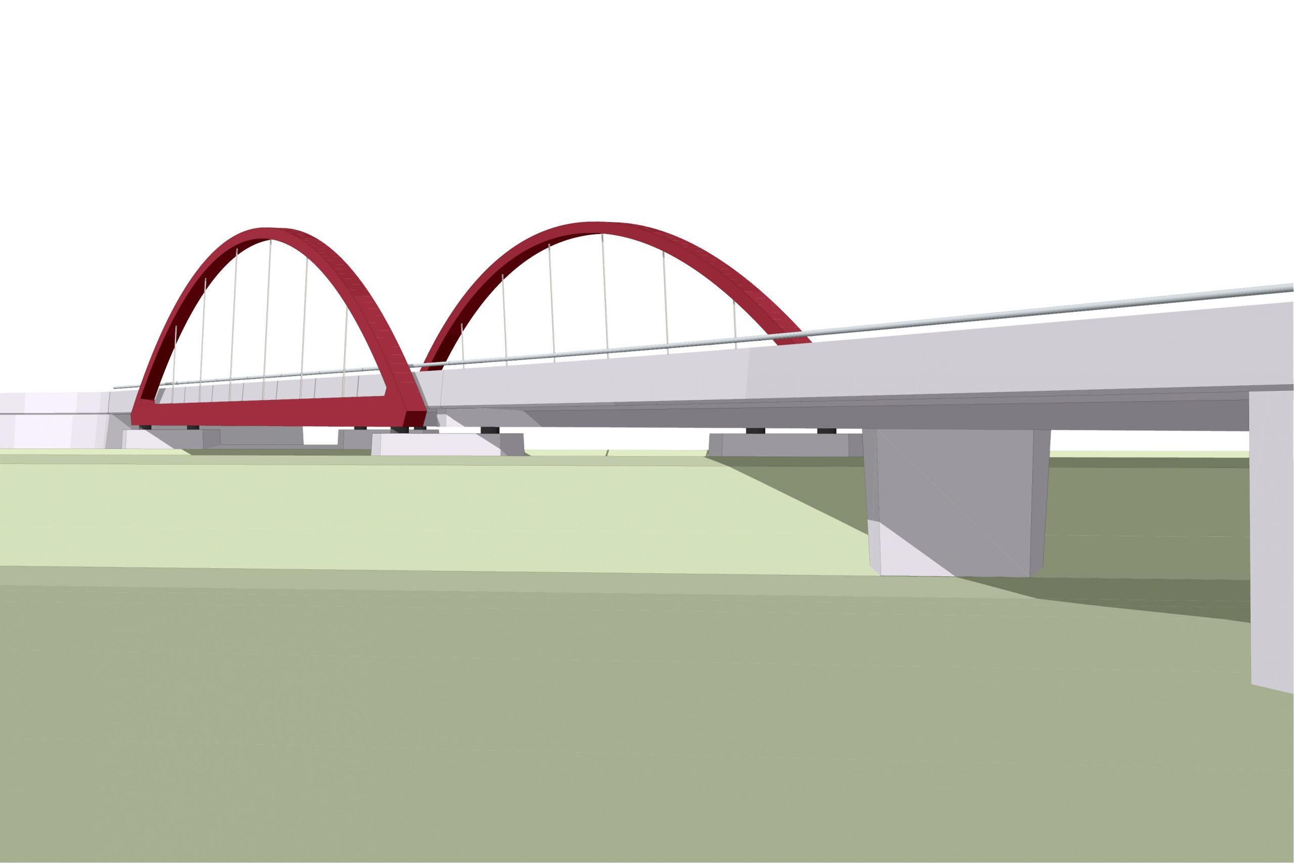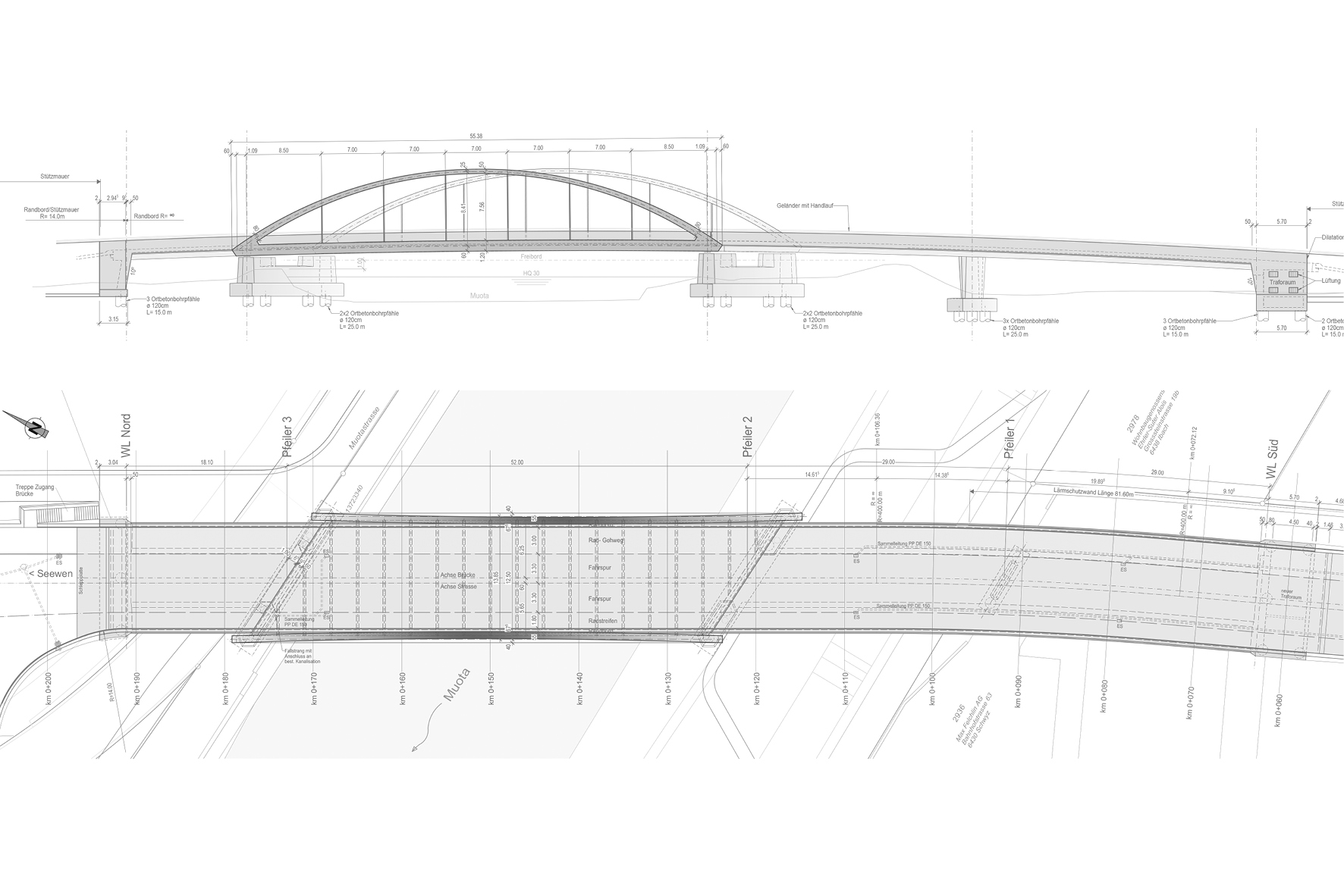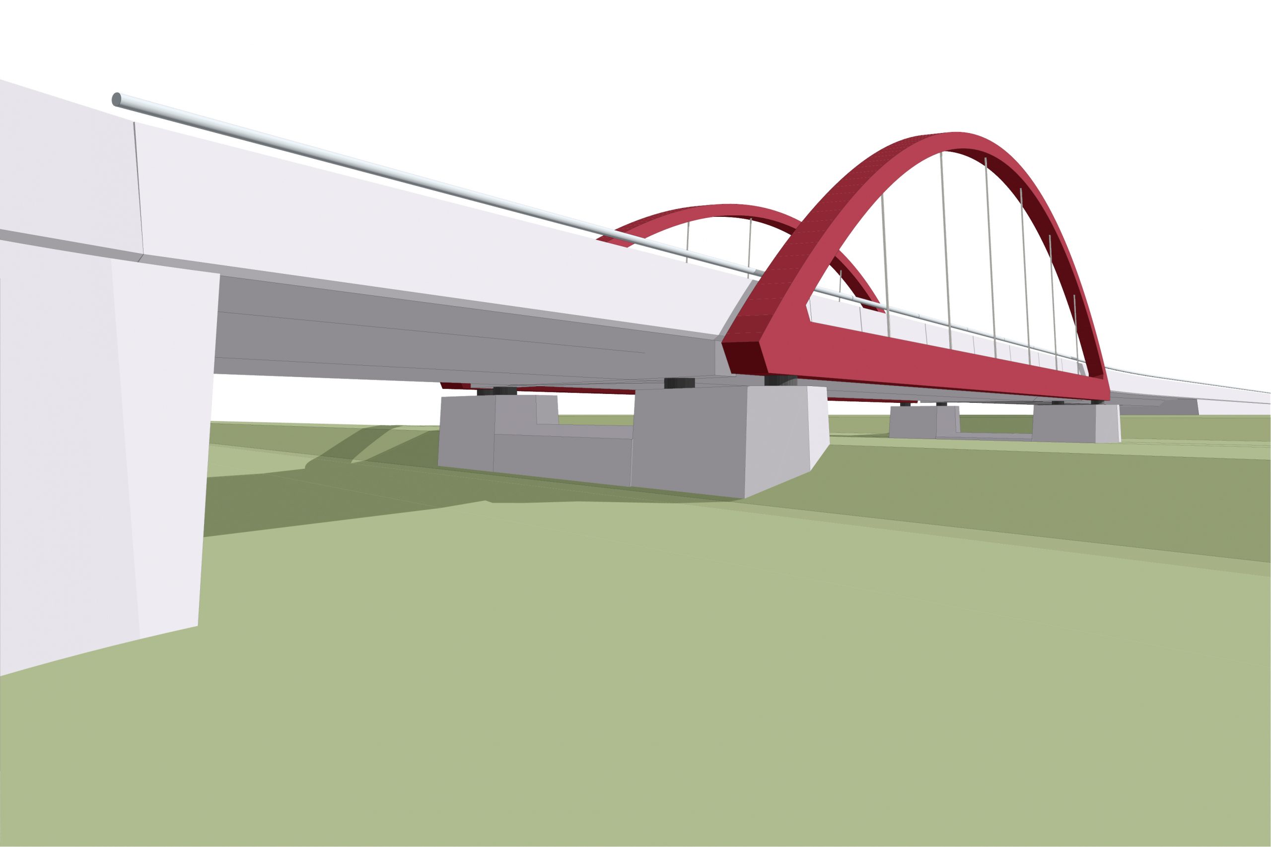 Die Muotabrücke Ibach West führt als Teil der Umfahrung von Schwyz über die Muota, wobei die leicht nach innen geneigten Bögen das von Dämmen gefasste Normalflussbett der Muota markieren.