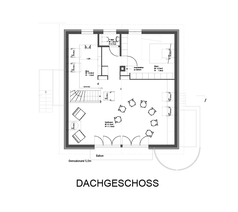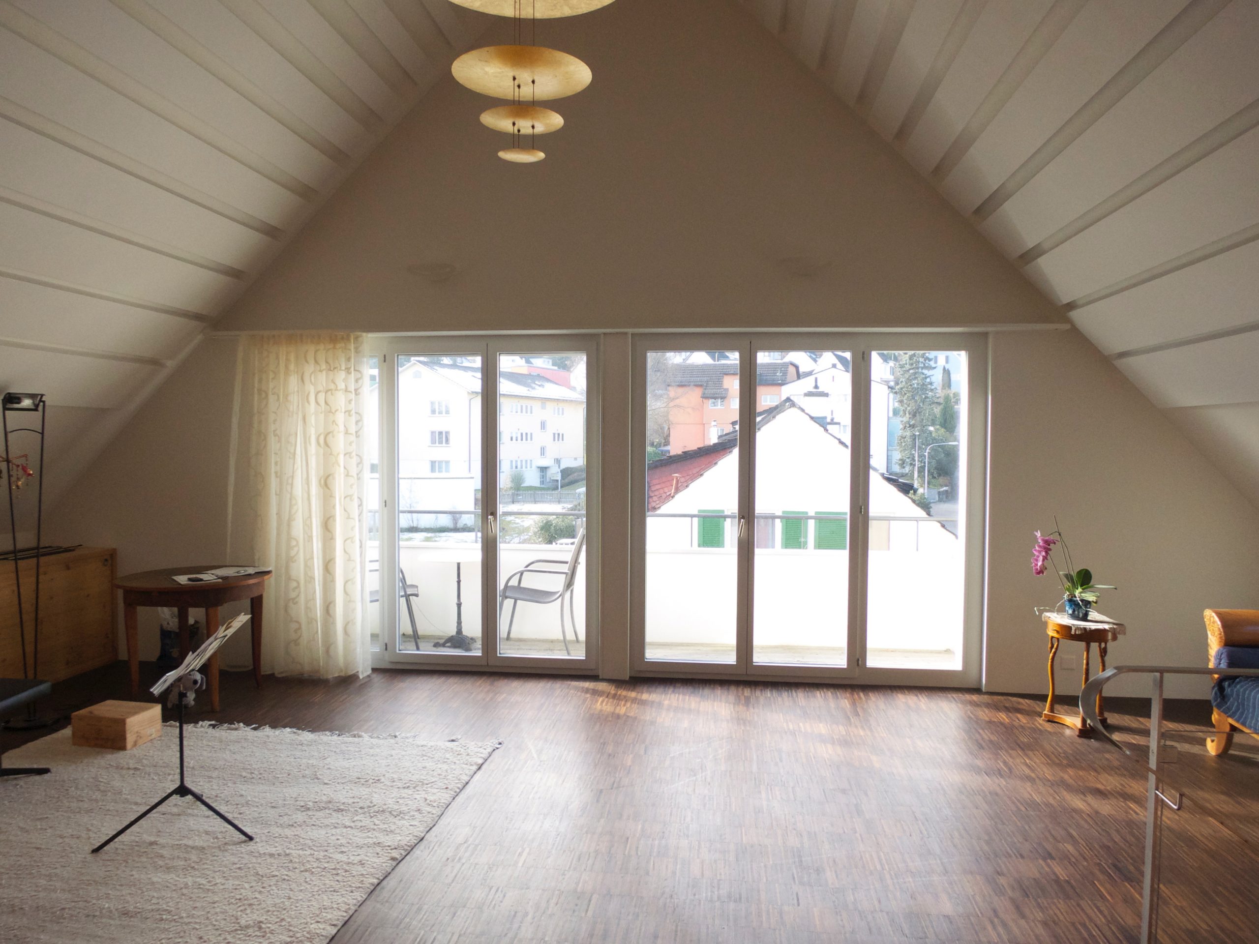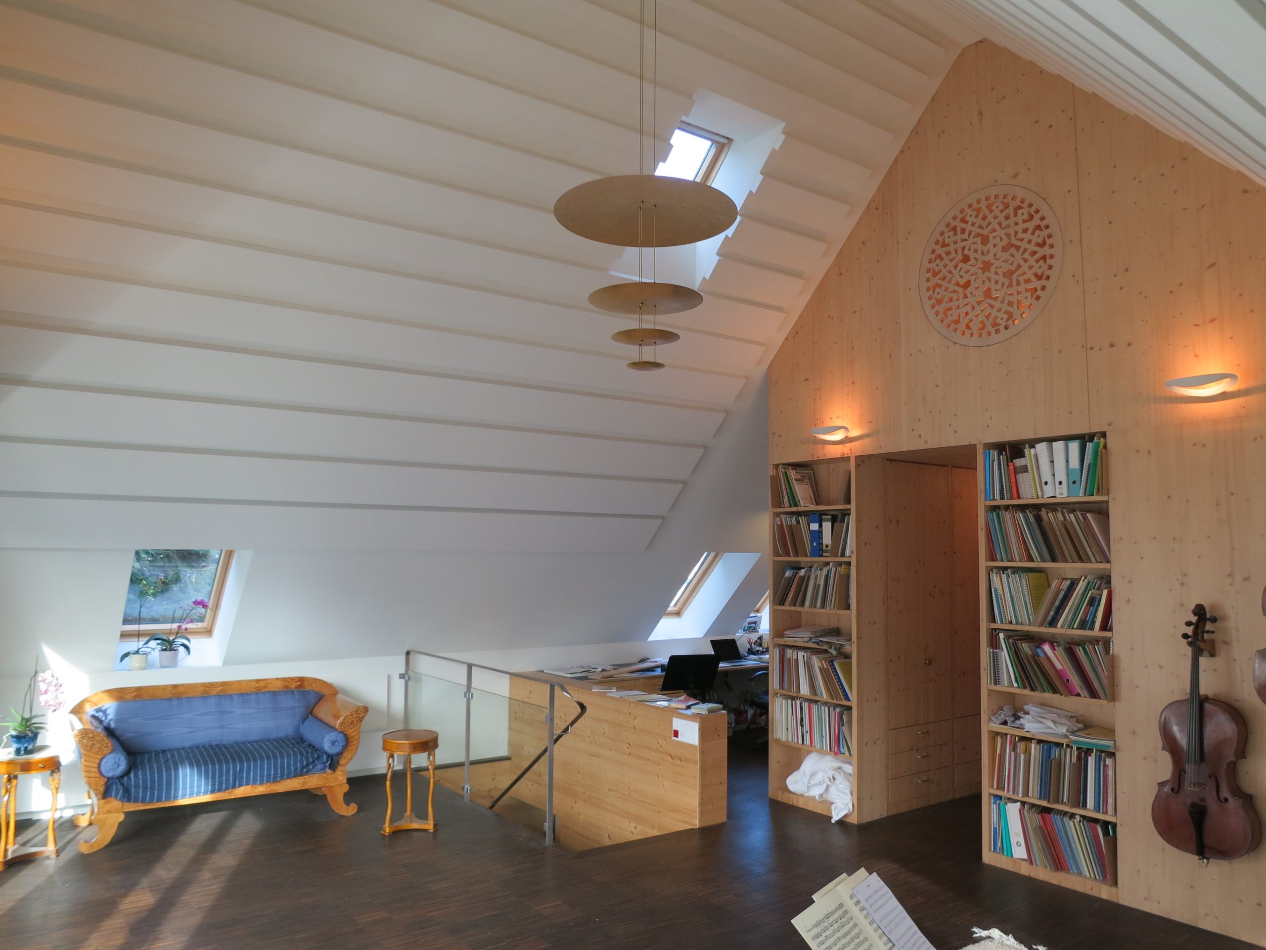 Dachaufstockung mit Musikraum für Berufsmusikerpaar klassischer Streichinstrumente. Das Dachgeschoss wird zum neuen Elterngeschoss mit einem grossen Raum für Unterricht, Probe, Konzerte, Büro, Notensammlung und Bad/Schlafzimmer. Sämtliche Einbauten sind aus der Holzart der Instrumente erstellt. Als akustische Installation erlaubt eine Rosette die Veränderung der Akustik durch die Kopplung des Schlafbereichs mit dem Musikraum. Das Haus wurde aussen isoliert und zeitgemässen energetischen Anforderungen angepasst, ohne seinen quartiertypischen Ausdruck zu verlieren. Bau in bewohntem Zustand.