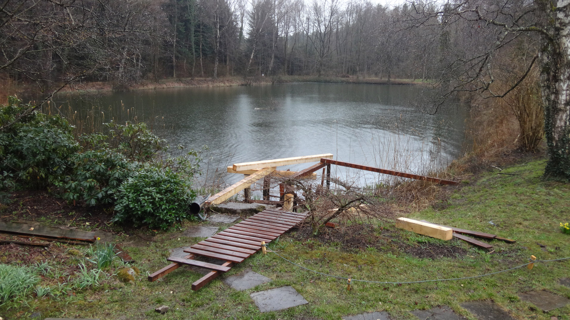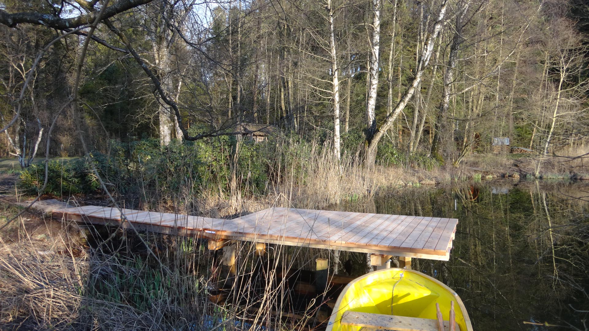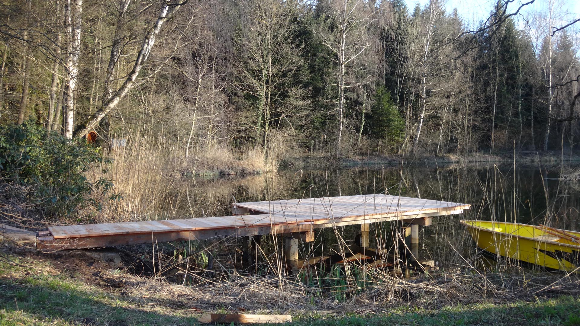 Wie vom Schilf eingeschnürt und zugleich gefasst führt der Ersatzsteg zur neuen Plattform am Privatweiher. Im Schutz des Schilfgürtels wird die grosszügige Plattform zum sommerlichen Zimmer über dem See und kann als geschütztes Sonnendeck oder Essbereich über dem Wasser genutzt werden.