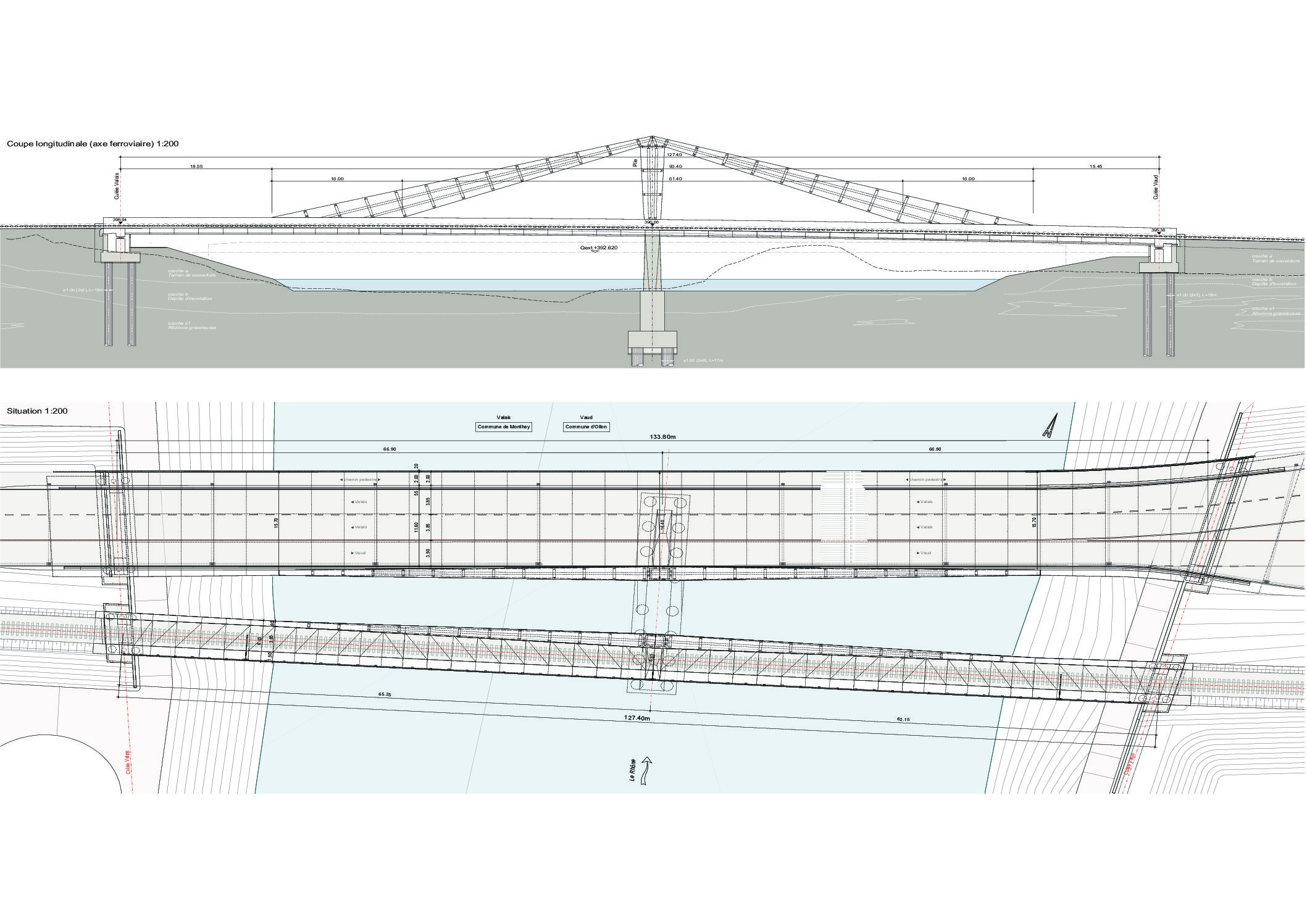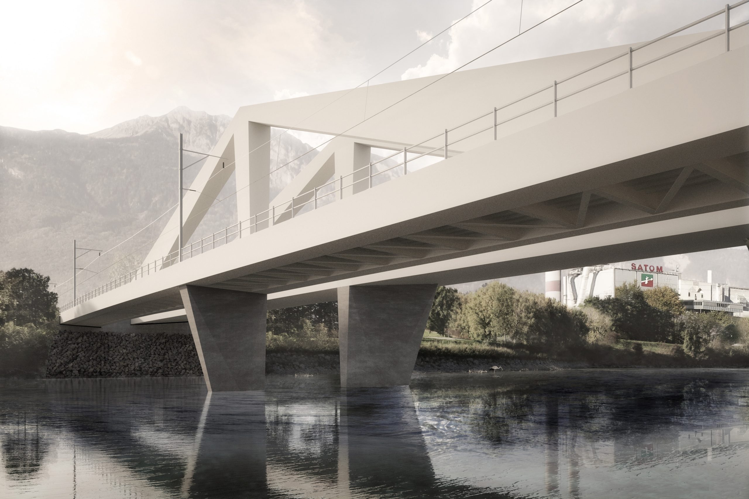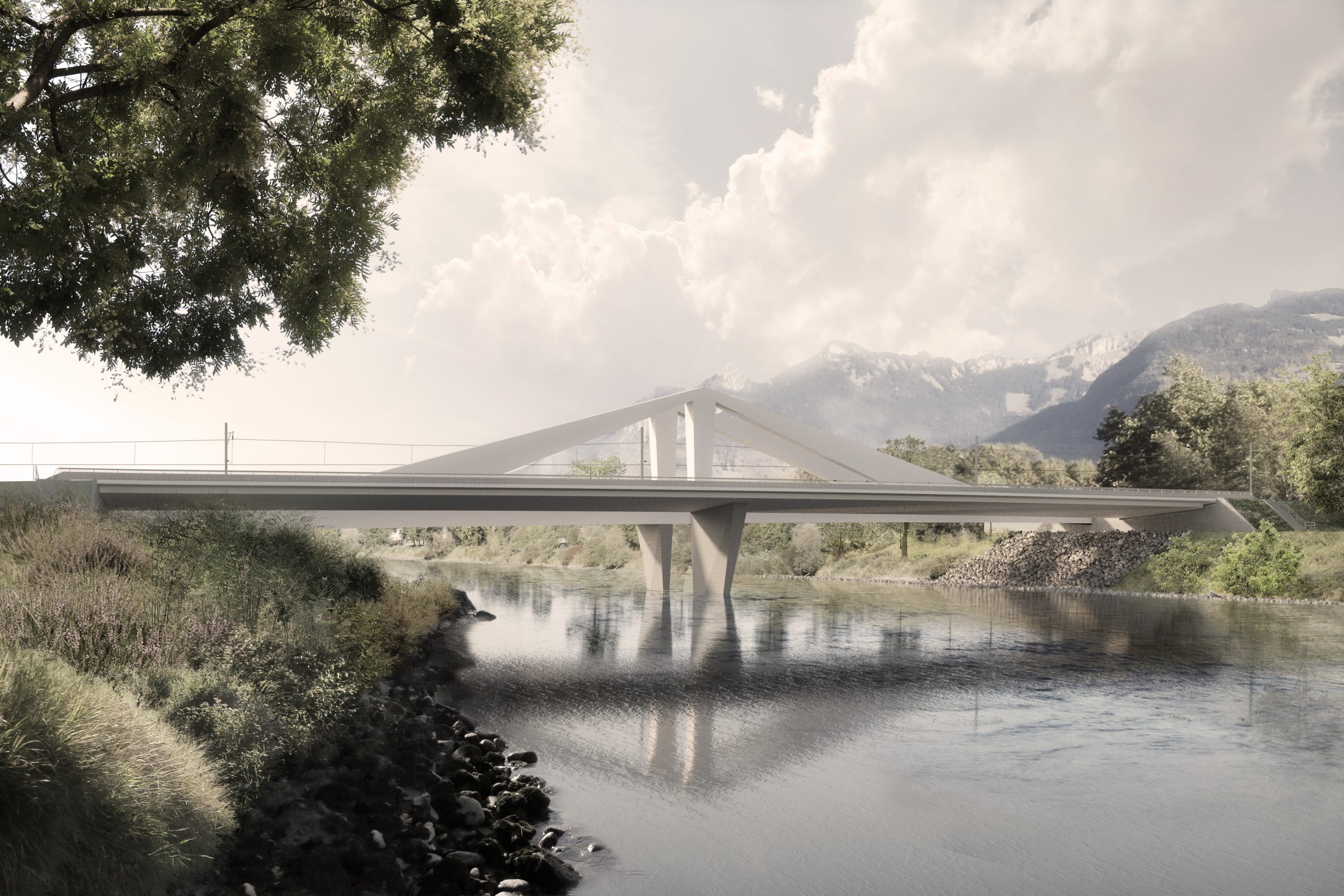 Die beiden ungleich breiten Brücken über die massiv verbreiterte Rhone werten den verkehrstechnisch wichtigen Ort auf, indem die markanten Stahlsegel-Kastentragwerke Rücken an Rücken stehend die Situation selbstbewusst besetzen. Dies führt zur Klärung in einer Umgebung, welche zunehmend unter dem Wildwuchs situativ entstehender Grossgewerbebauten leidet.