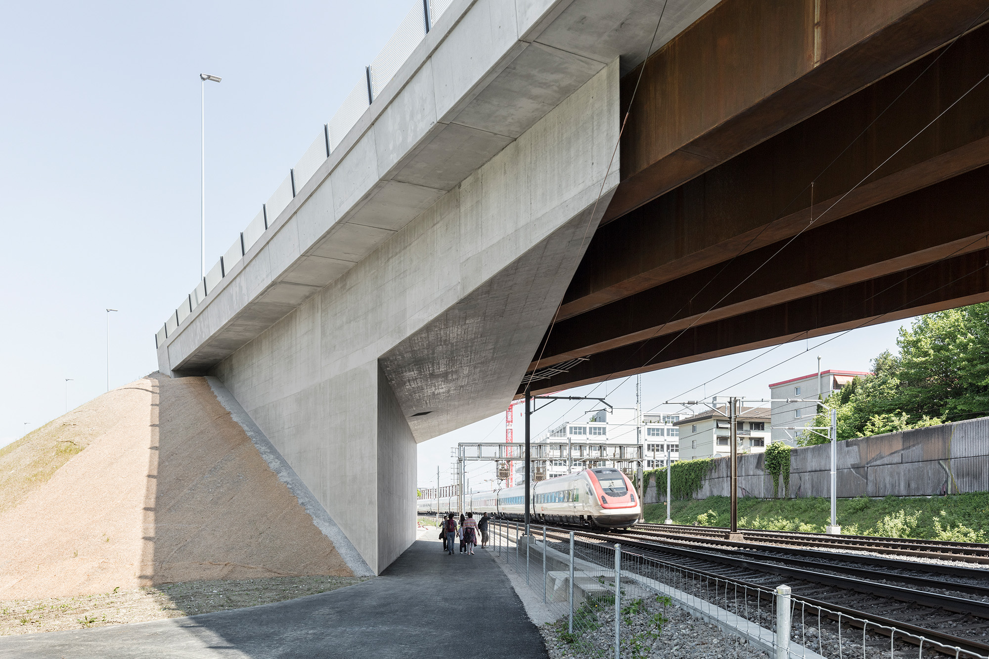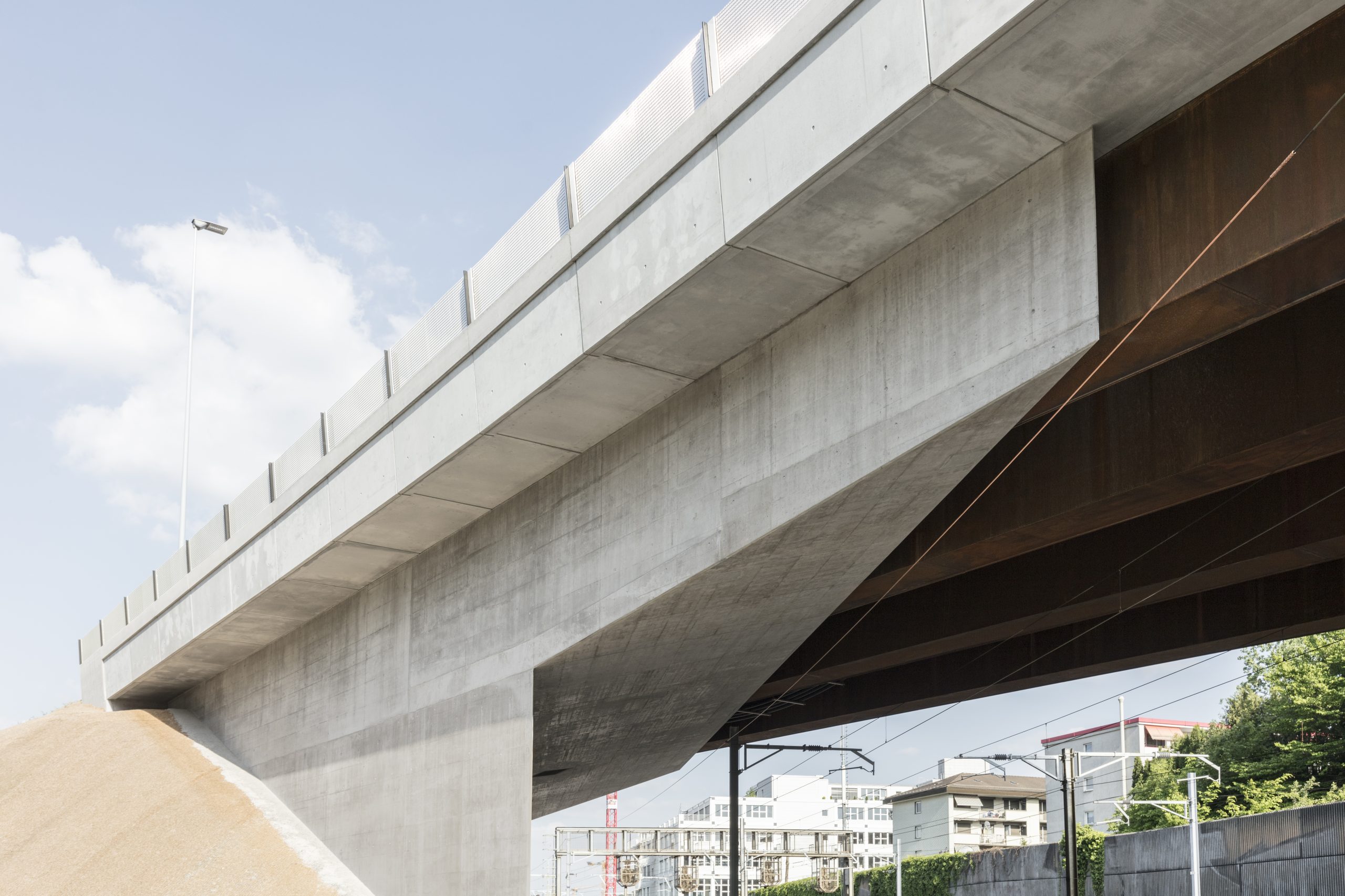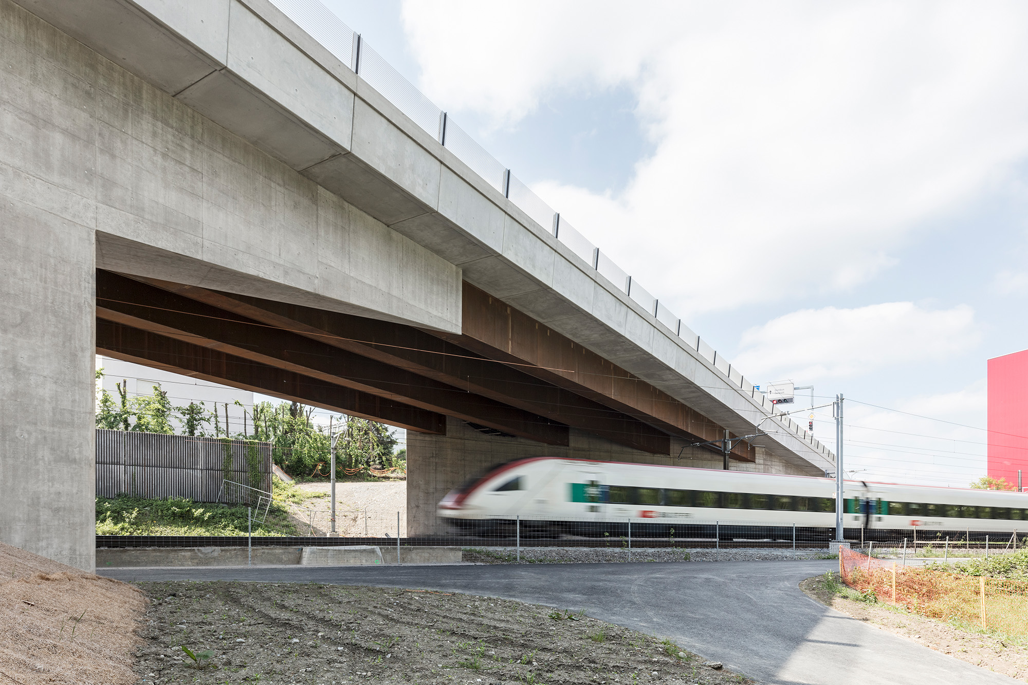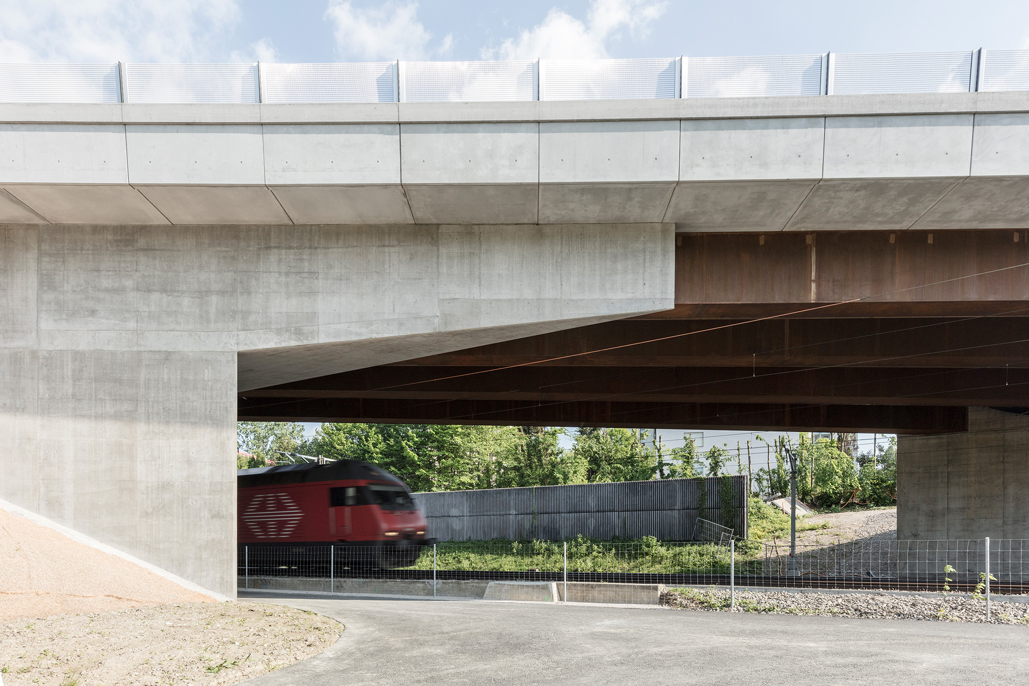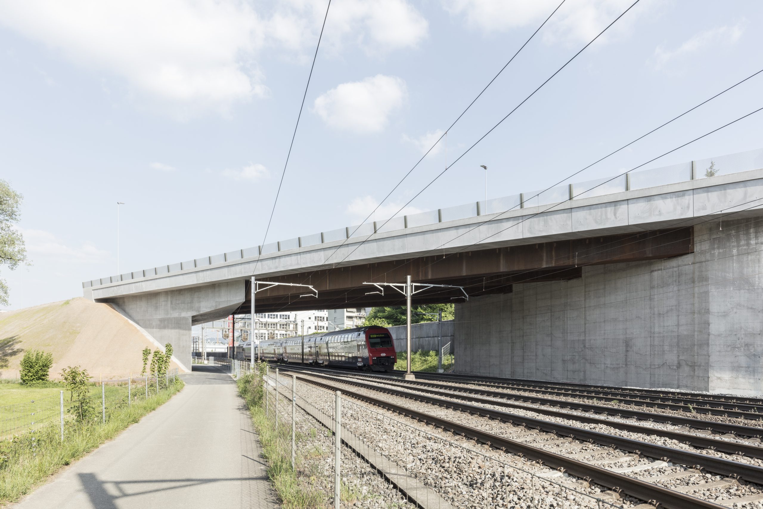 Die Rahmenbrücke spannt 30 Grad schief gelagert über das Hauptgleisfeld der SBB zwischen Schlieren und Dietikon. Die Konstruktion mit vorgefertigten Betonelementen, welche zusammen mit dem darüber gegossenen Ortbeton und den Trägerkasten aus wetterfestem Stahl einen Verbund herstellen, ermöglicht den Verzicht auf Lehr- und Schutzgerüste. Die Brücke zeigt was sie ist: aus den Gegebenheiten des Ortes und einem optimierten Bauverfahren entwickelte Effizienz in kräftiger Eleganz.