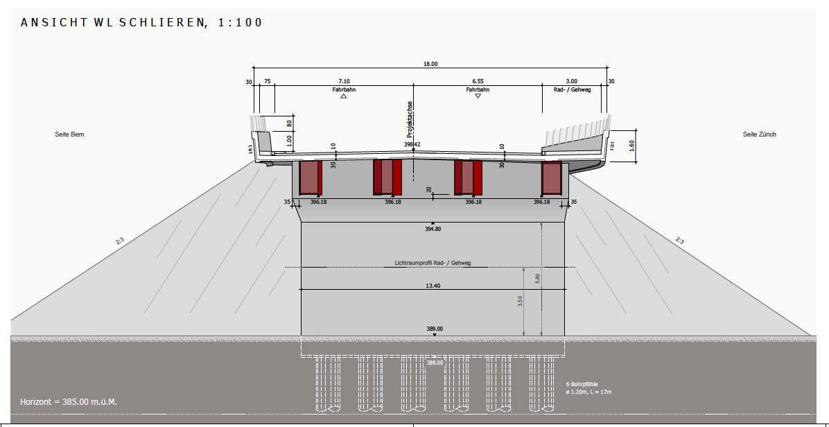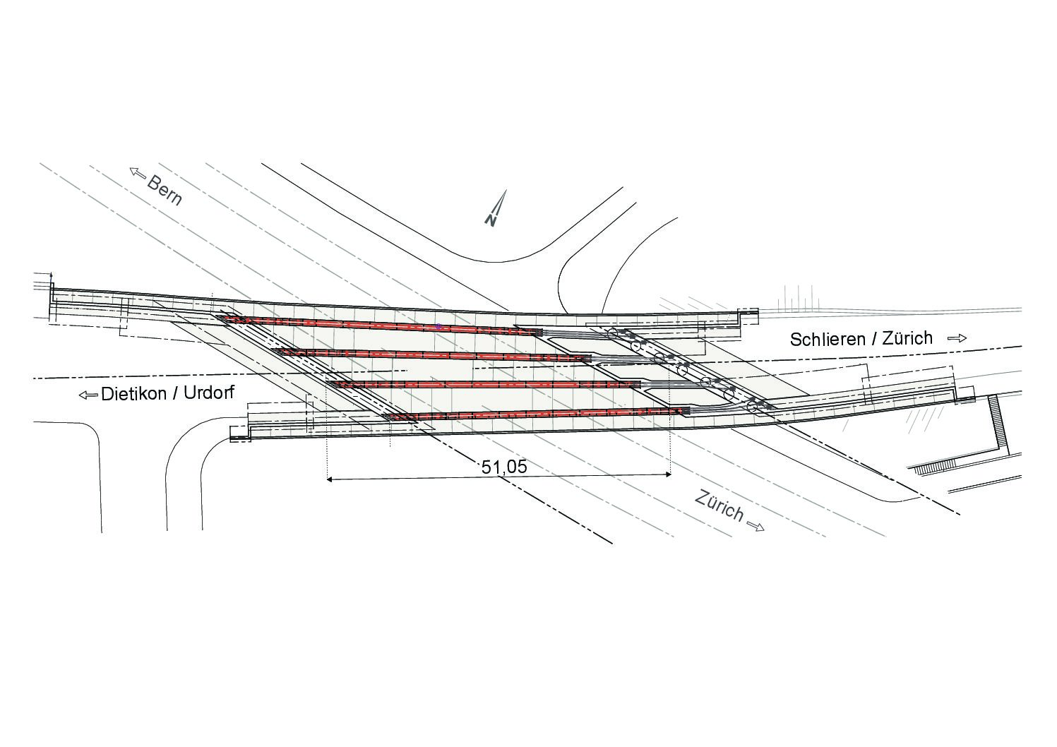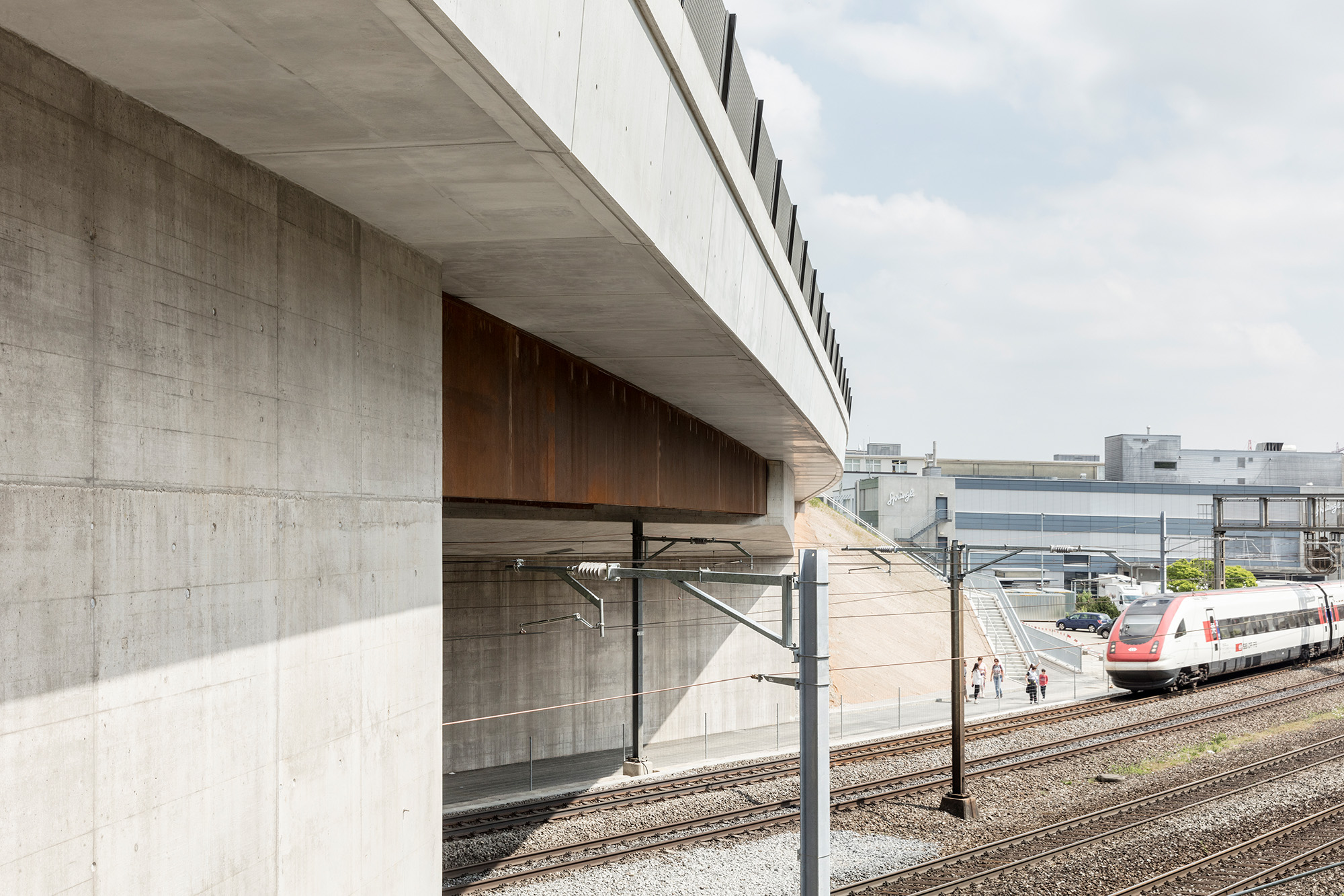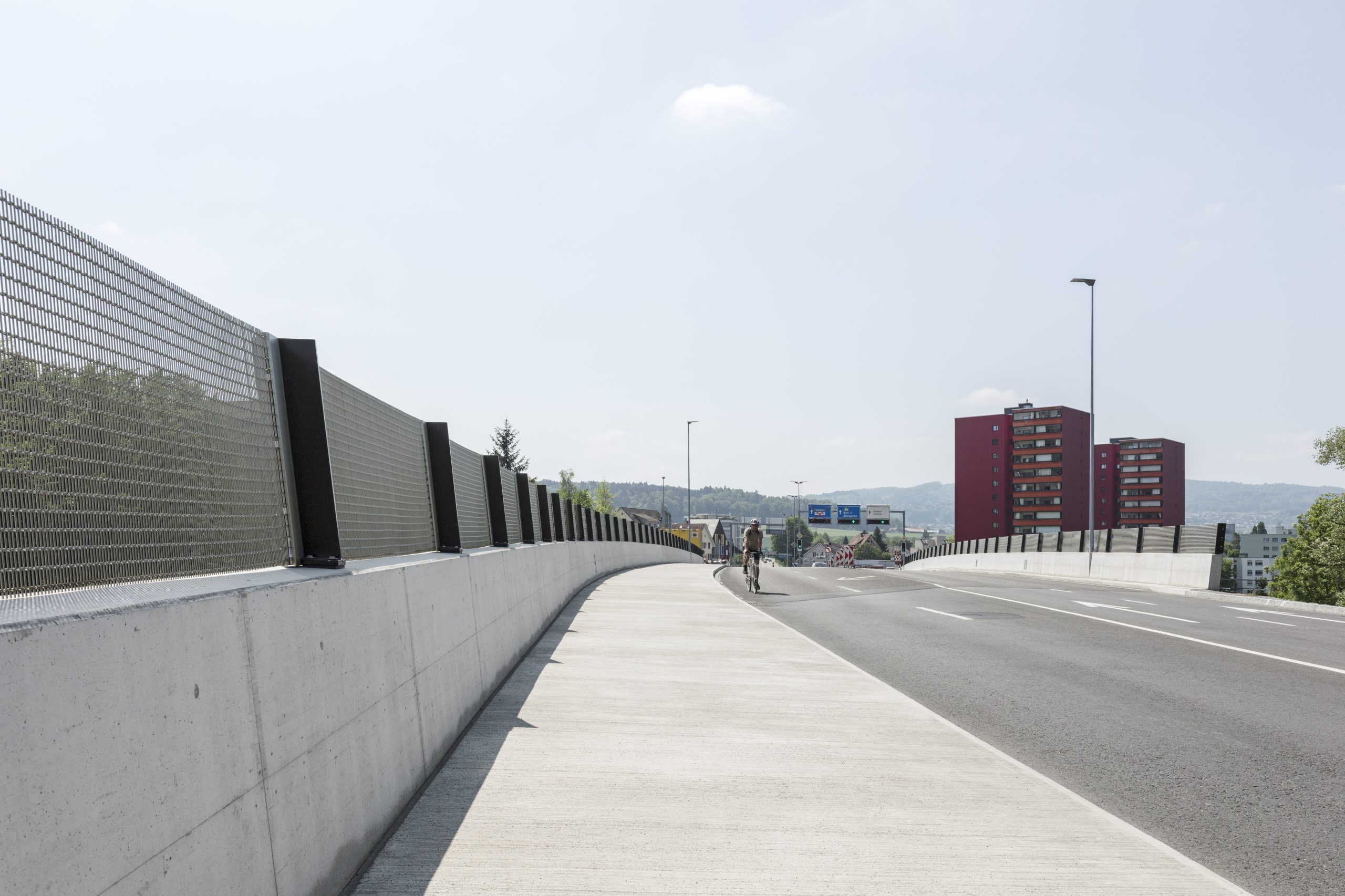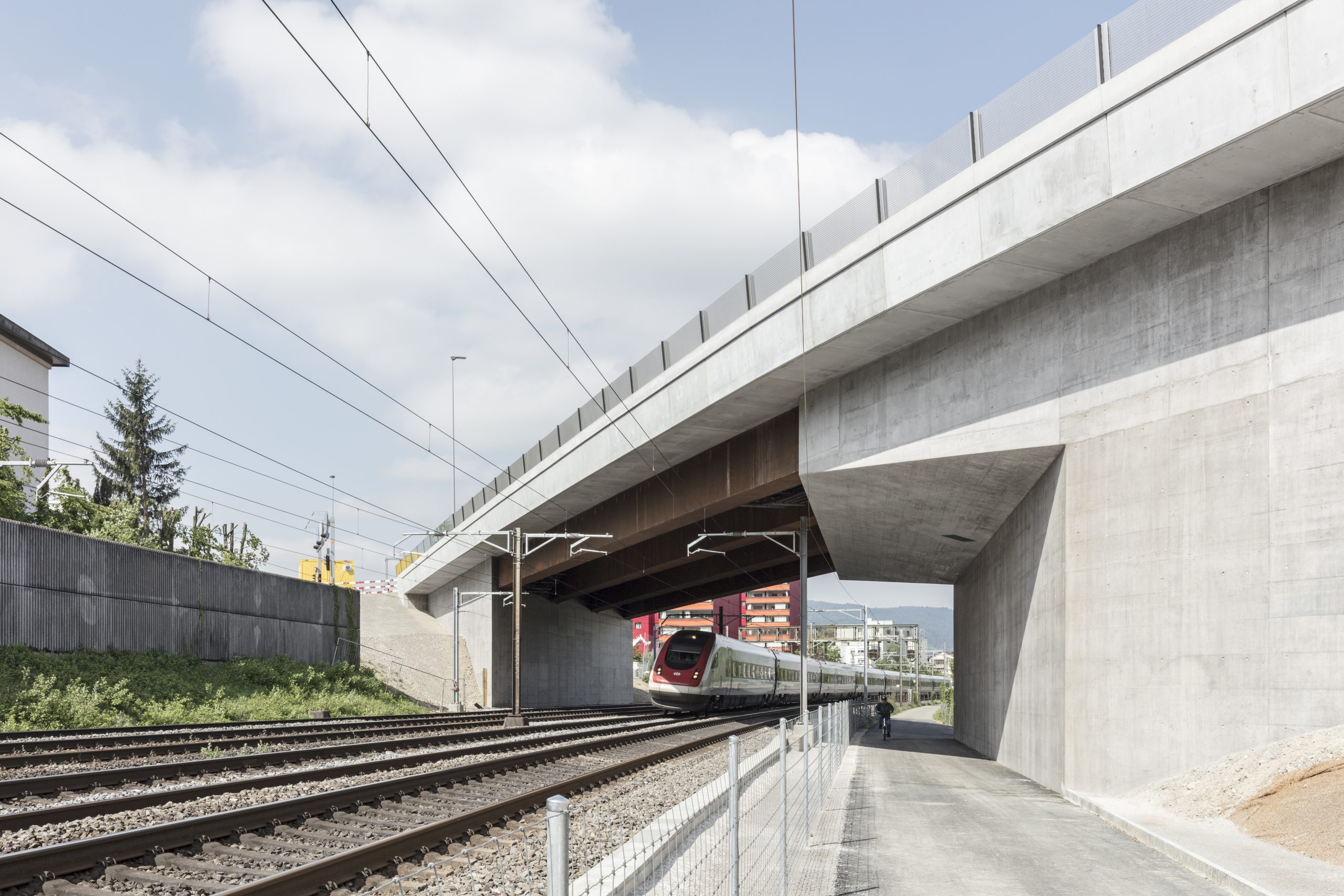 Die Rahmenbrücke spannt 30 Grad schief gelagert über das Hauptgleisfeld der SBB zwischen Schlieren und Dietikon. Die Konstruktion mit vorgefertigten Betonelementen, welche zusammen mit dem darüber gegossenen Ortbeton und den Trägerkasten aus wetterfestem Stahl einen Verbund herstellen, ermöglicht den Verzicht auf Lehr- und Schutzgerüste. Die Brücke zeigt was sie ist: aus den Gegebenheiten des Ortes und einem optimierten Bauverfahren entwickelte Effizienz in kräftiger Eleganz.