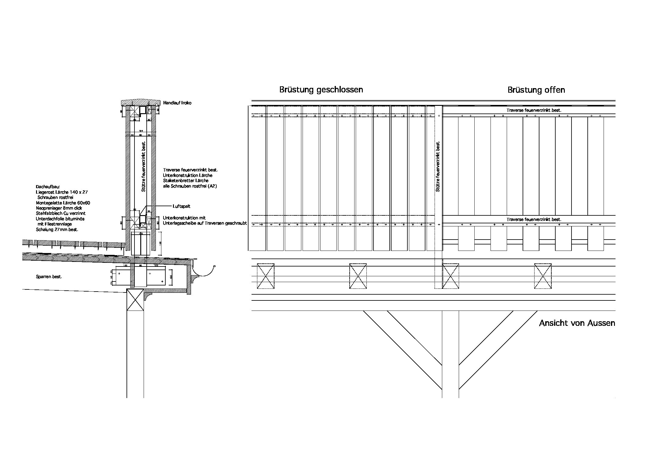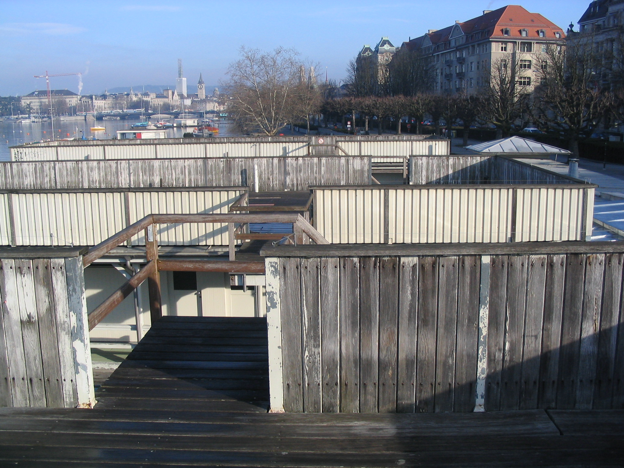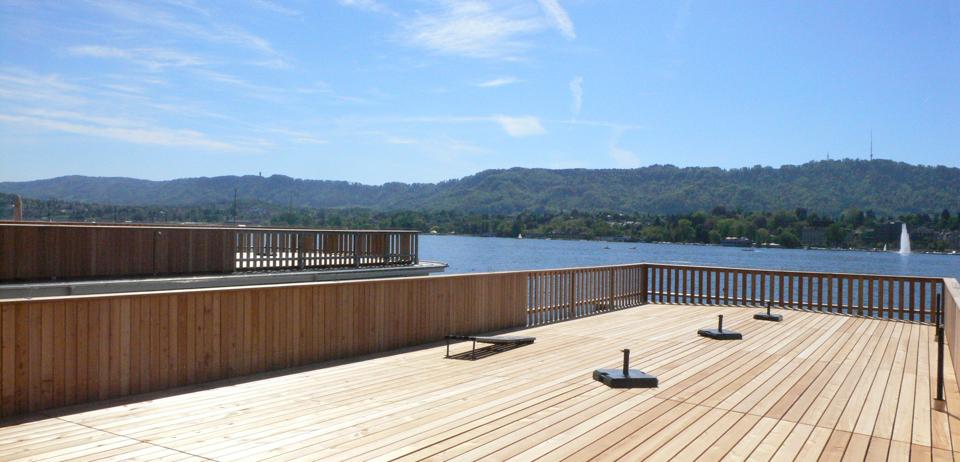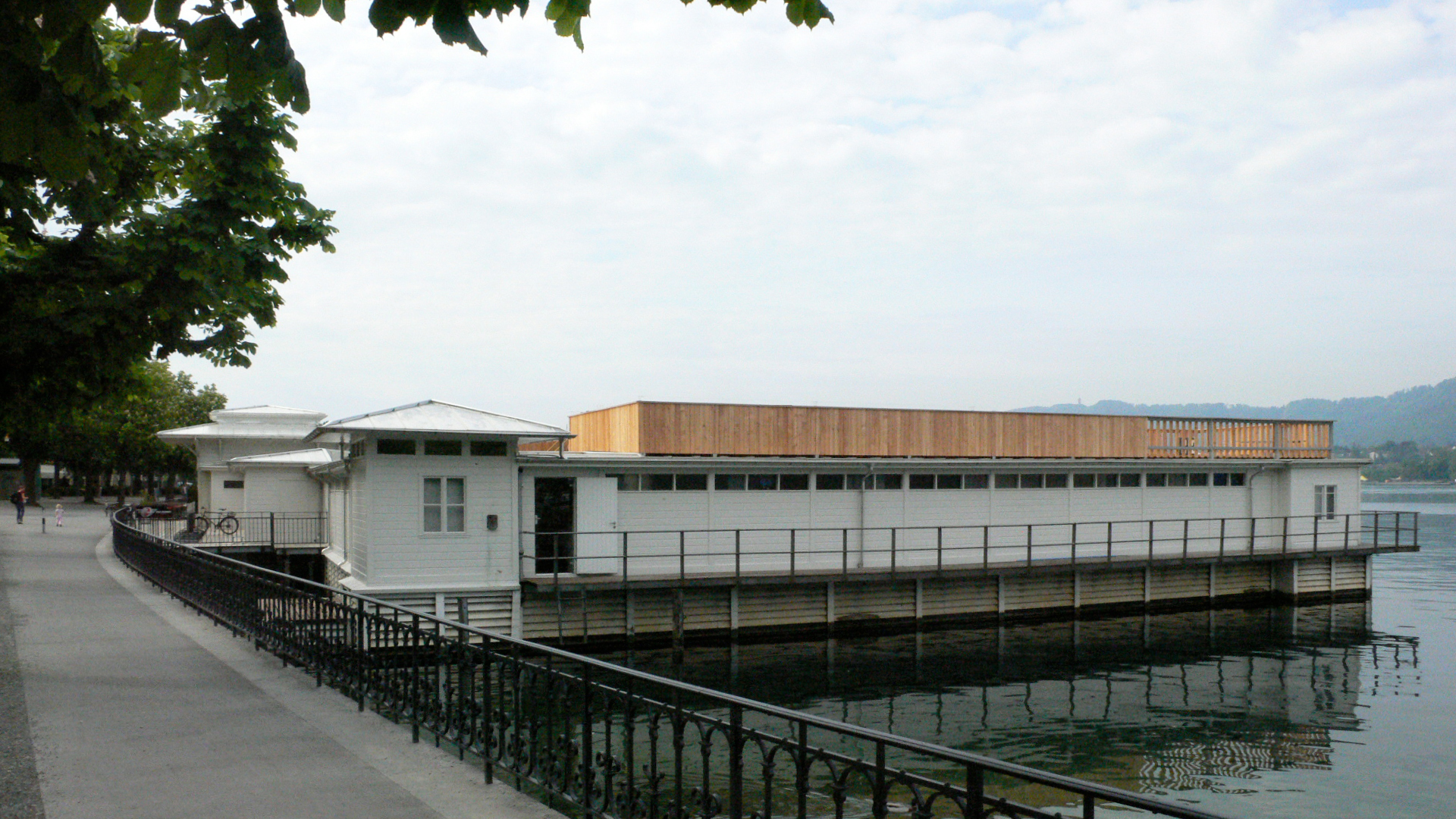 Das Seebad aus der Jahrhundertwende ist eines der beliebtesten Freibäder Zürichs. Als ursprünglich eingeschossige, fünffingrige Anlage vermögen die in den Siebzigerjahren zugefügten Sonndecks architektonisch und denkmalpflegerisch nicht mehr zu genügen und werden neu formuliert. Durch die halbtransparente Öffnung der Holzbrüstungen werden der Bezug zum See und die Aufenthaltsqualität deutlich verbessert und gleichzeitig der Schutz vor Einblick und Verkehrslärm aufrecht erhalten.