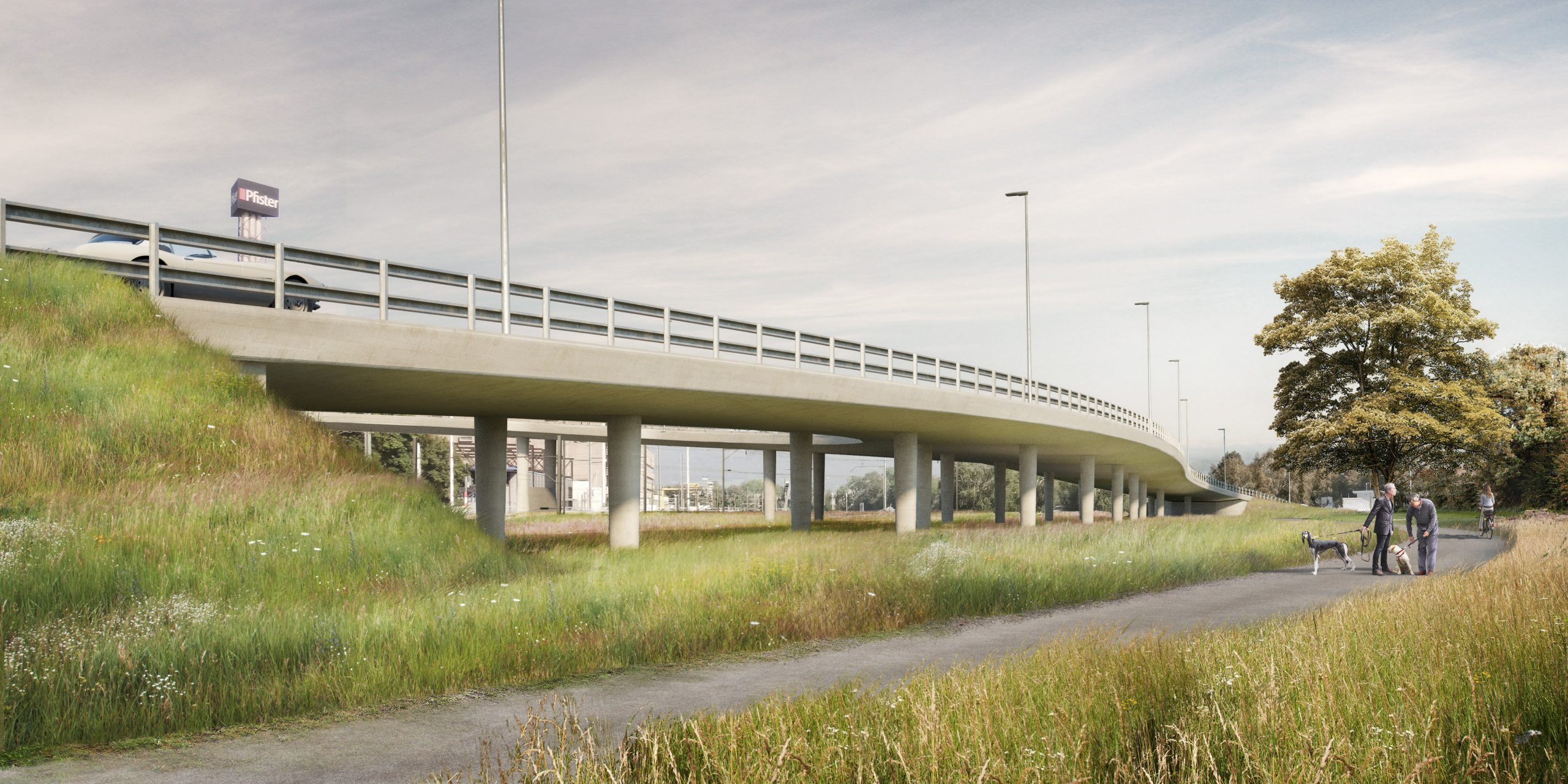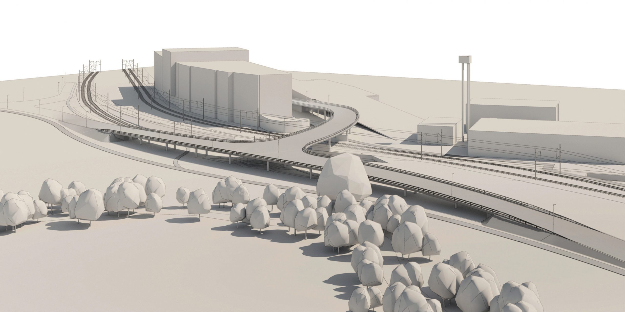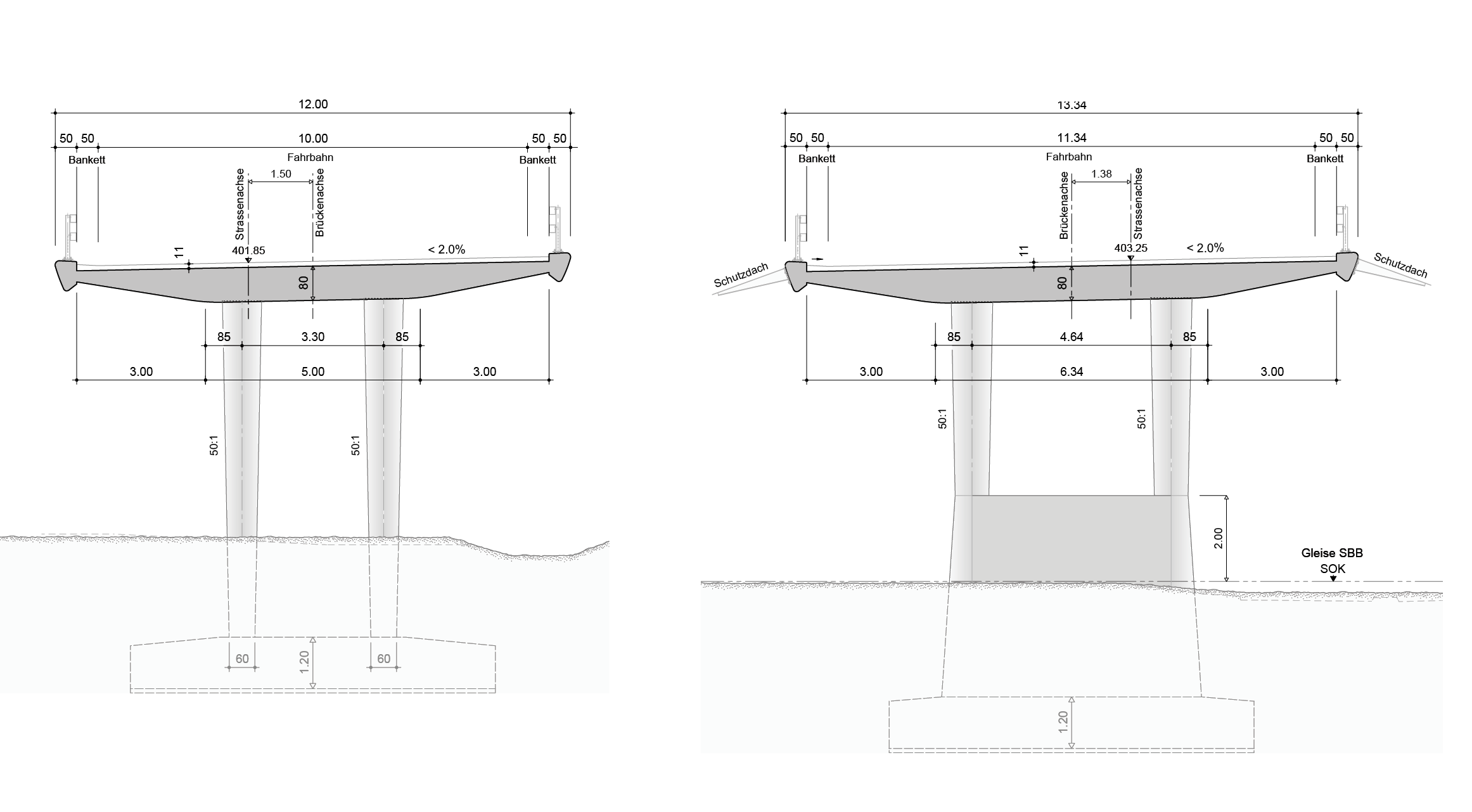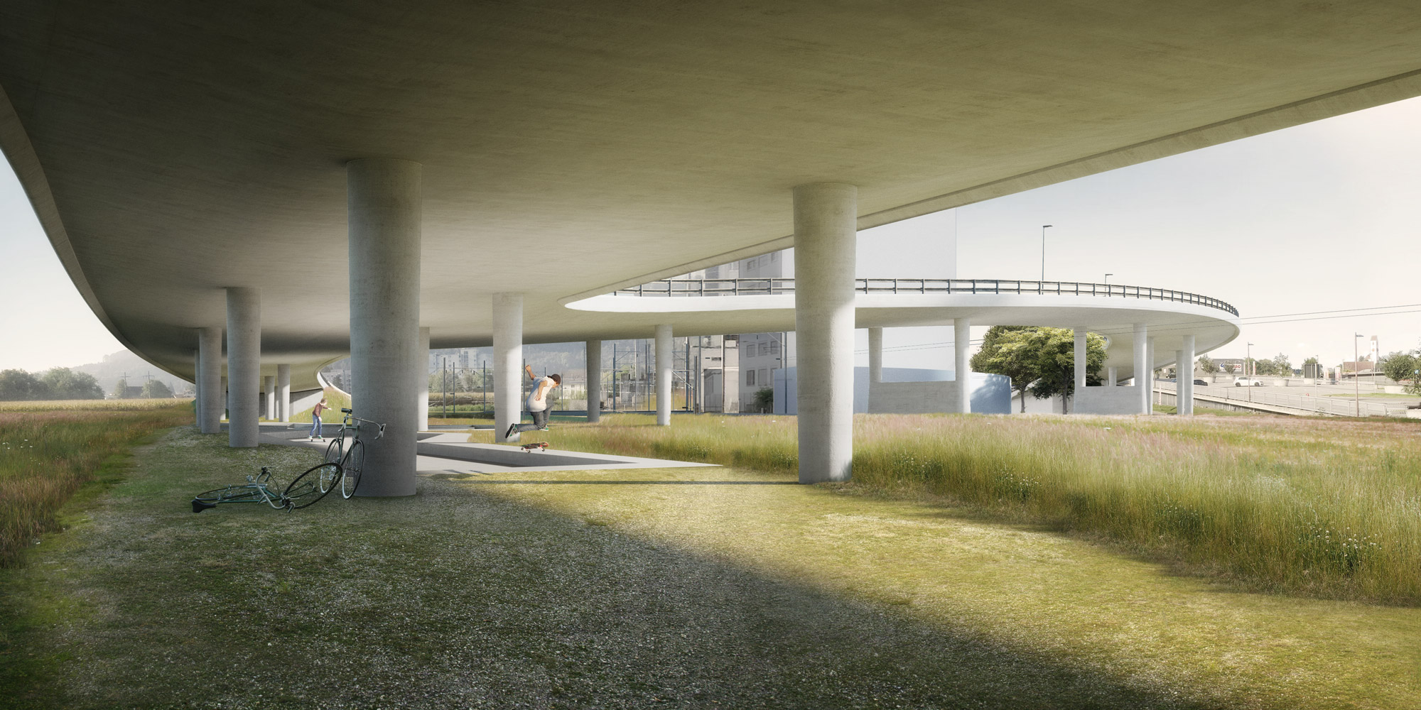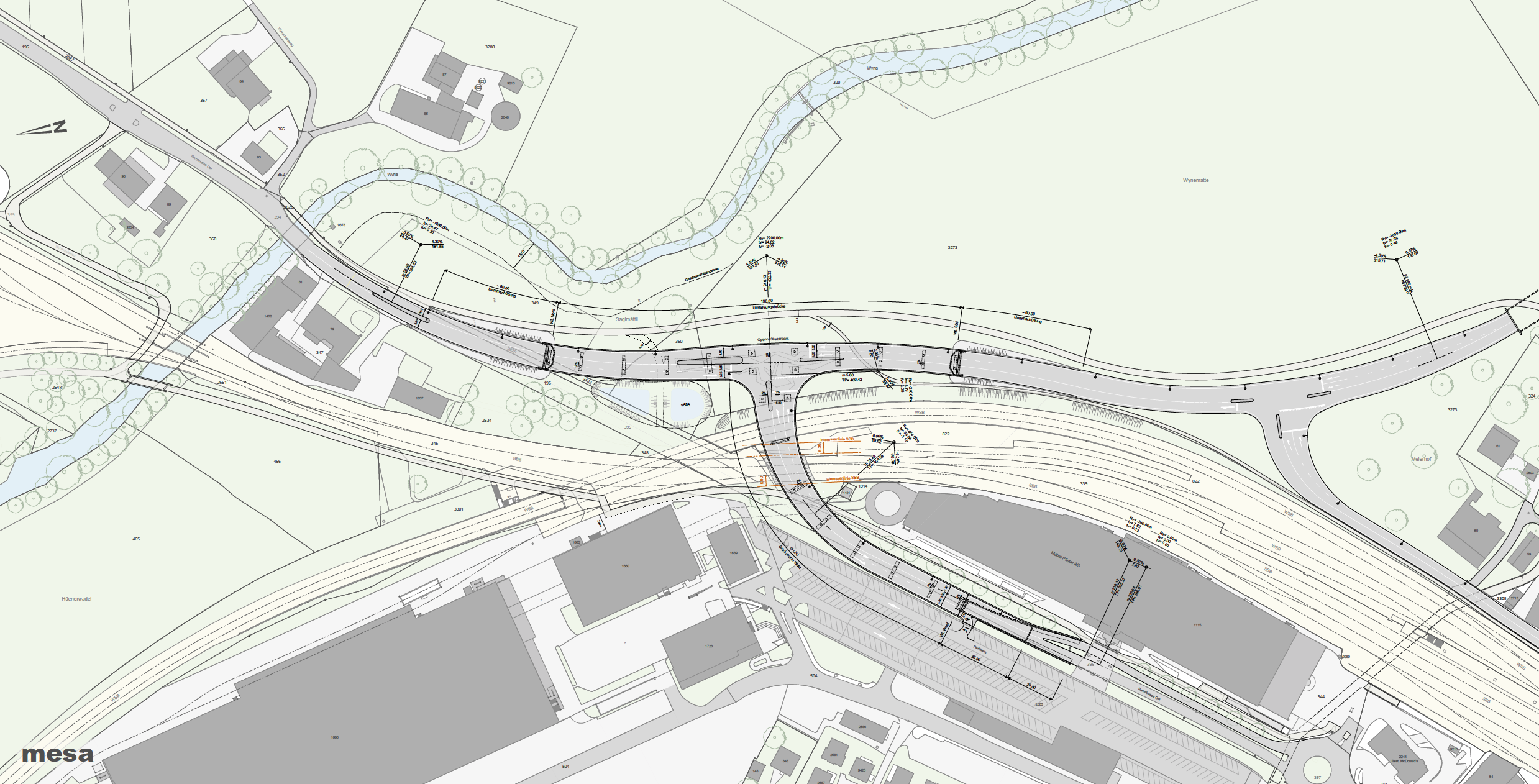 Das schlanke und homogene Brückenbauwerk bildet sowohl Umfahrungsstrasse als auch Überfahrt über die Bahngleise und Ortszufahrt mit Direktanschluss zum Parkdeck des riesigen Möbelverkäufers. Wie ein schlanker mehrarmiger Tisch auf vielen feinen Beinen fügt sich das Objekt behutsam in die Umgebung ein und trennt konsquent motorisierten von nicht motorisiertem Verkehr.