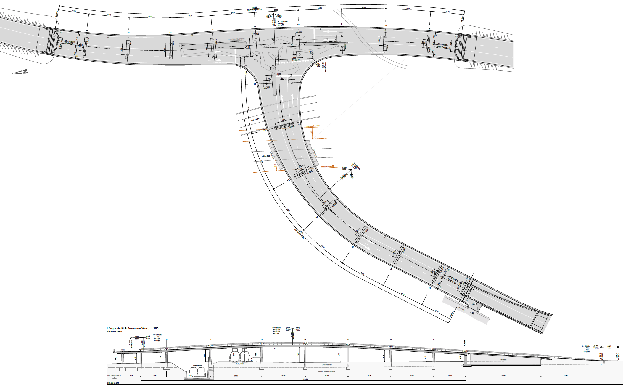 Das schlanke und homogene Brückenbauwerk bildet sowohl Umfahrungsstrasse als auch Überfahrt über die Bahngleise und Ortszufahrt mit Direktanschluss zum Parkdeck des riesigen Möbelverkäufers. Wie ein schlanker mehrarmiger Tisch auf vielen feinen Beinen fügt sich das Objekt behutsam in die Umgebung ein und trennt konsquent motorisierten von nicht motorisiertem Verkehr.