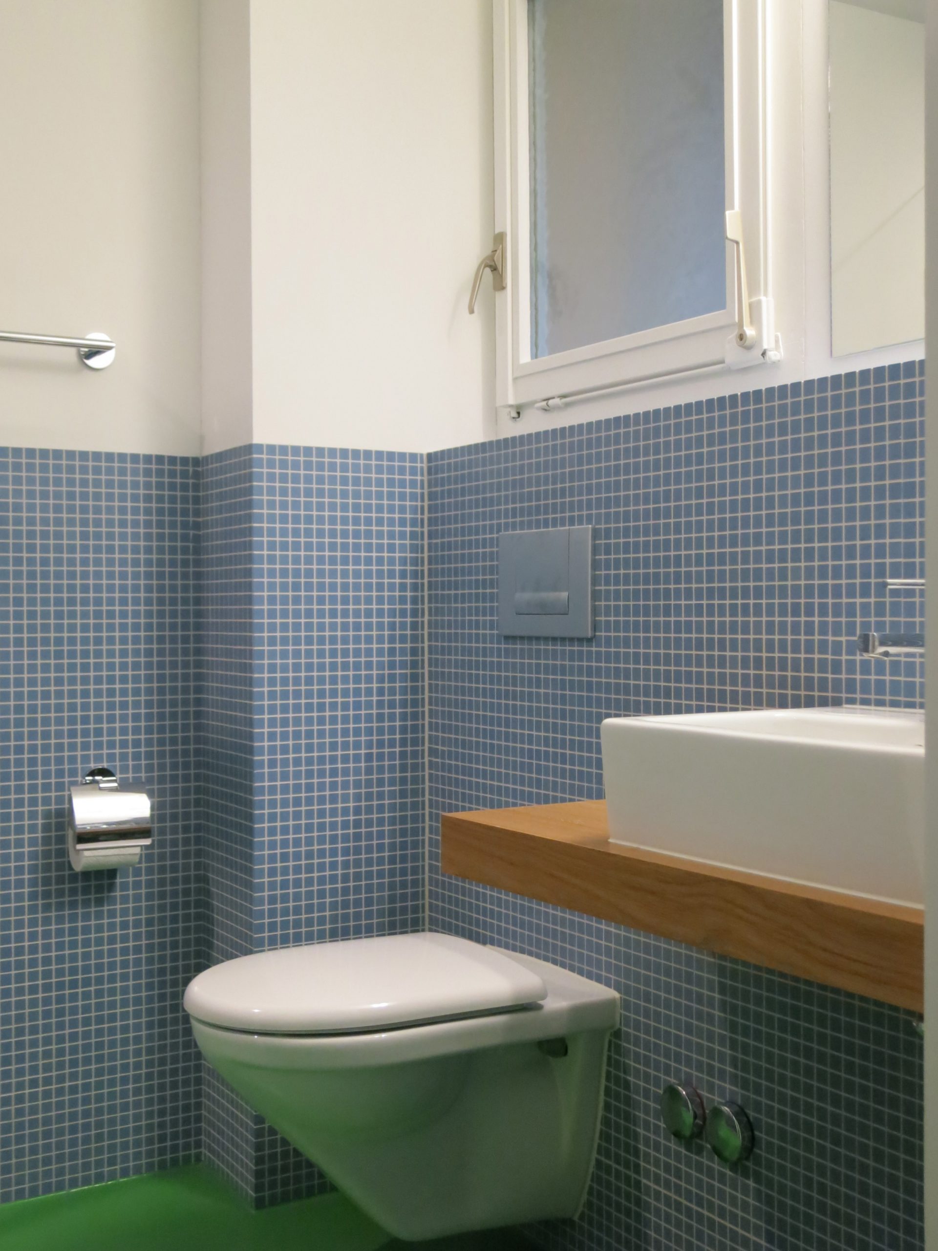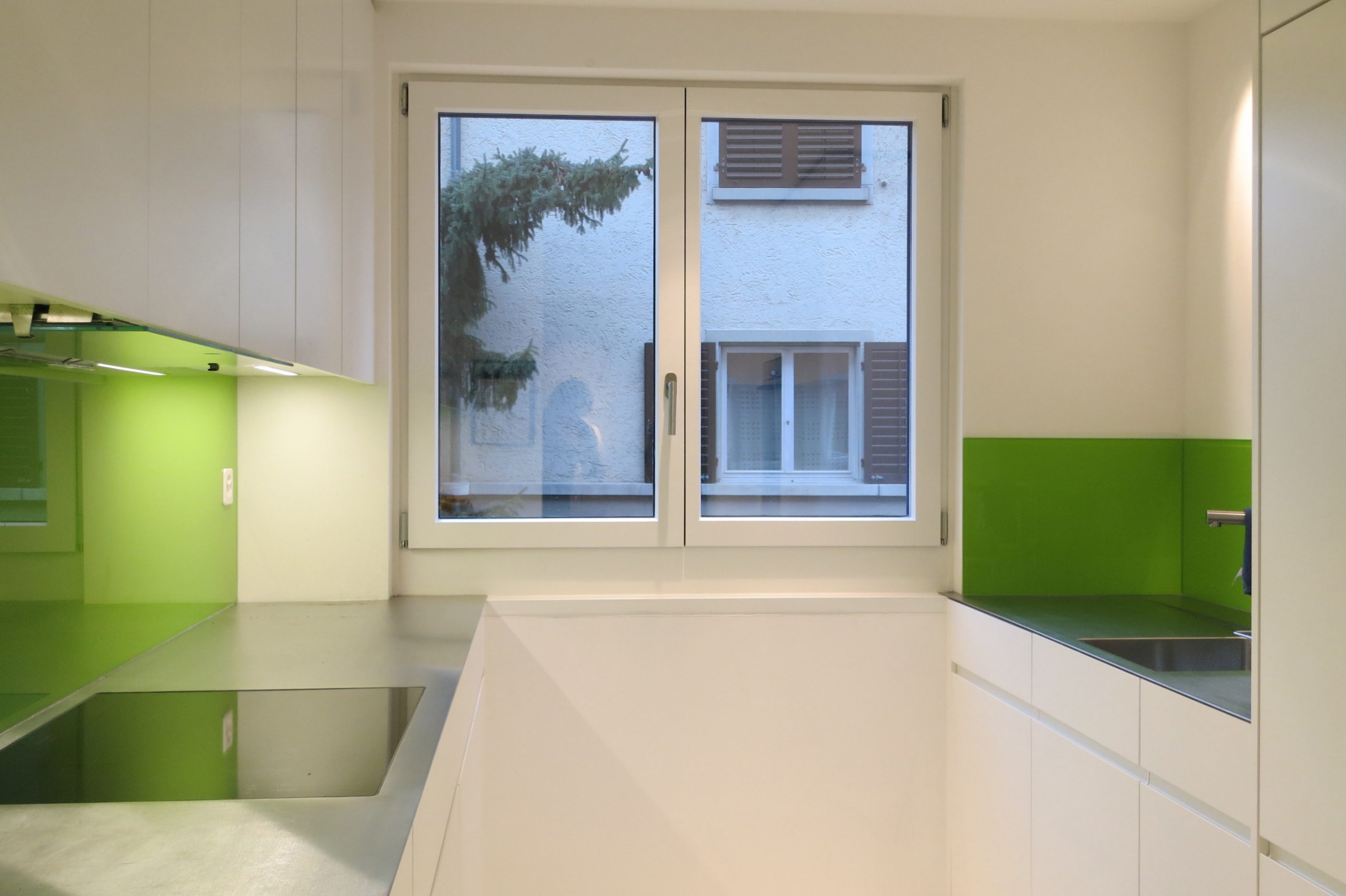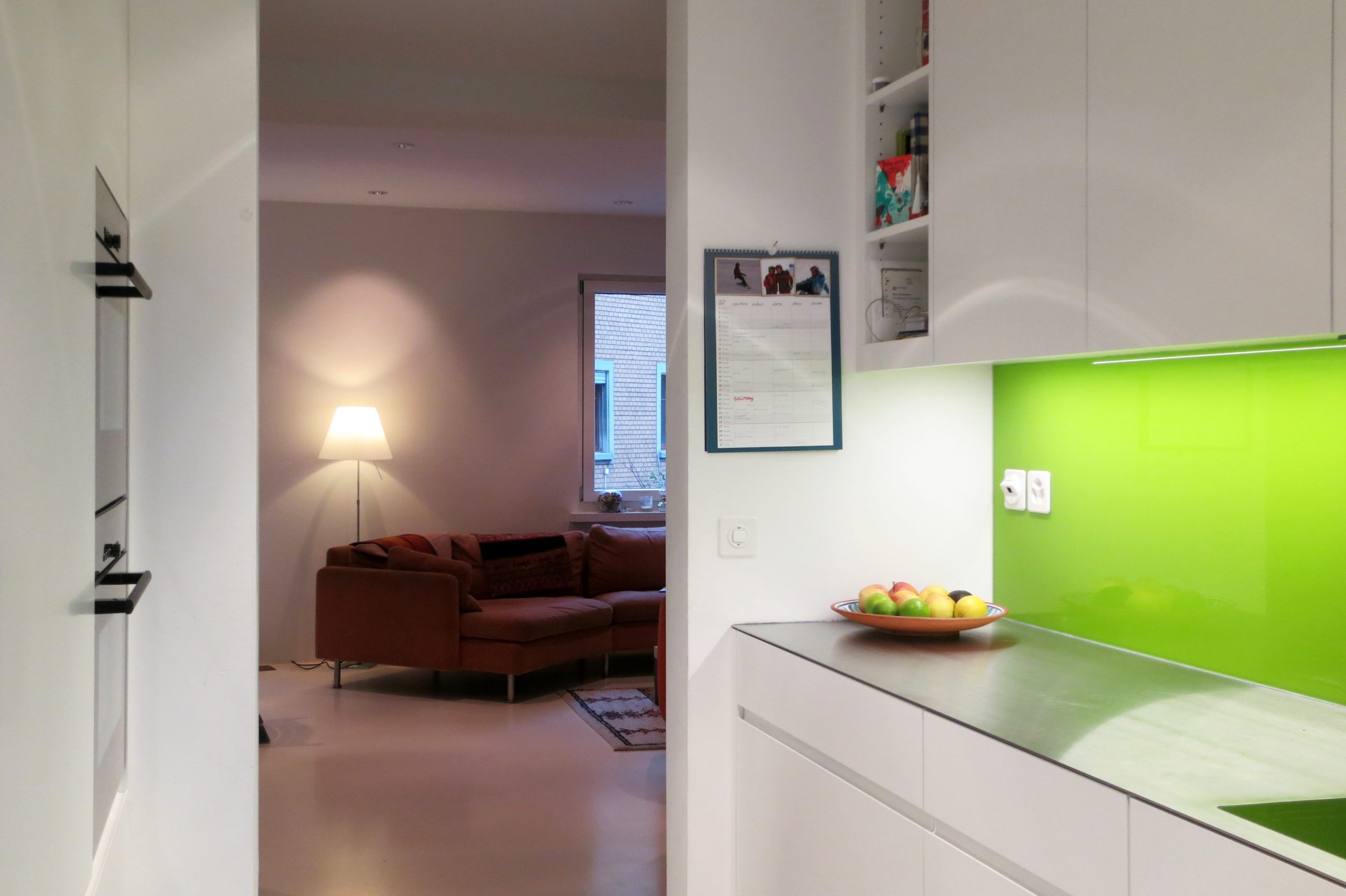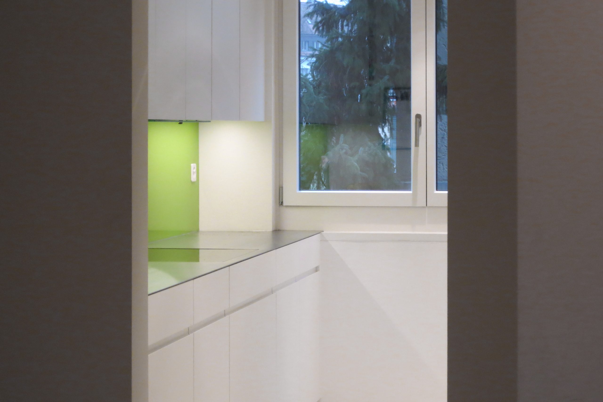 Im Zuge der Zusammenlegung zweier kleiner Geschosswohnungen wurden Küche und Bad umgebaut und eine zusätzliche Nasszelle mit Dusche/WC eingefügt.